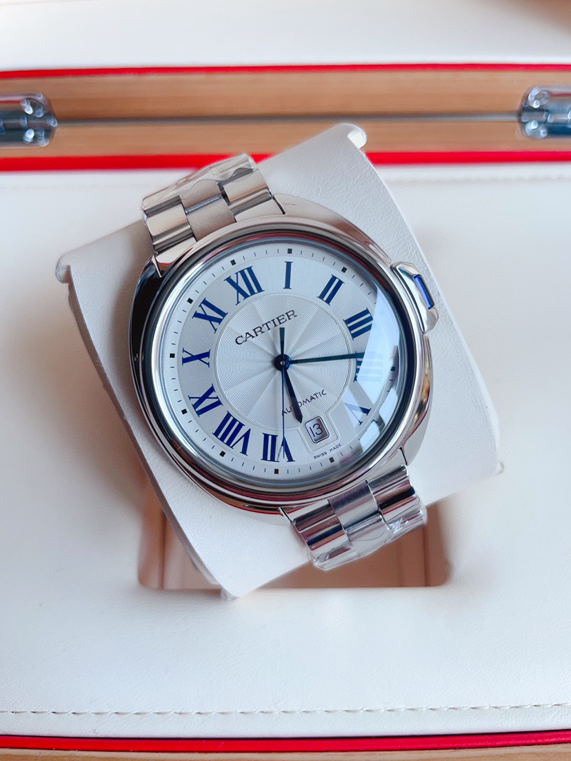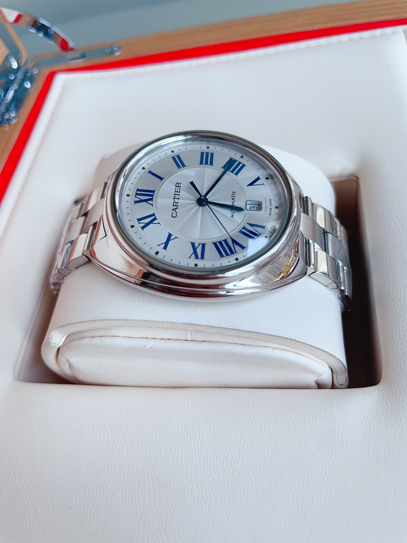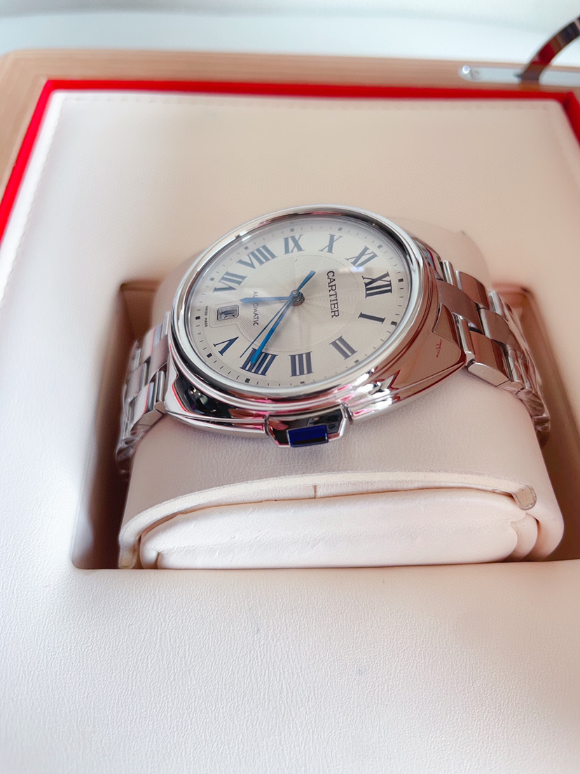 卡地亚钥匙系列 WSCL0007 男士腕表 自动机械 40mm表径 精钢材质 镀银雕纹太阳纹表盘 蓝钢剑形指针 钥匙形表冠 折叠扣 背透 日期显示 公价40500 ———顾客需知———