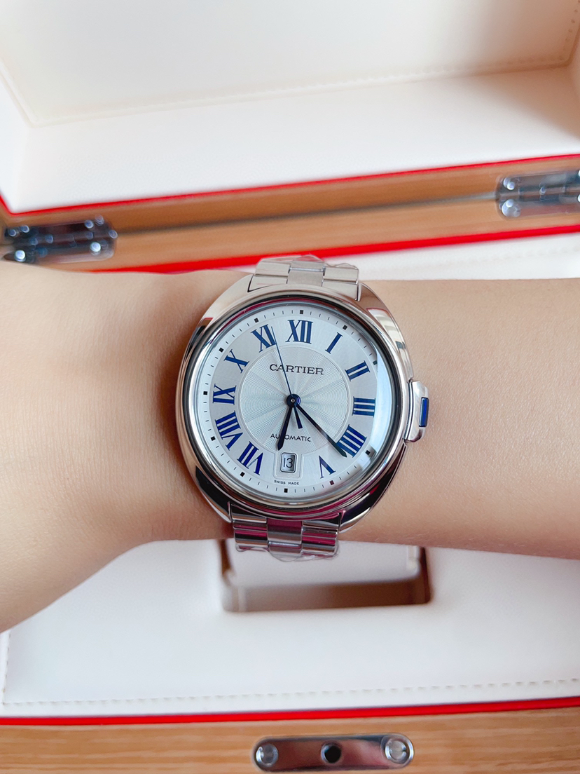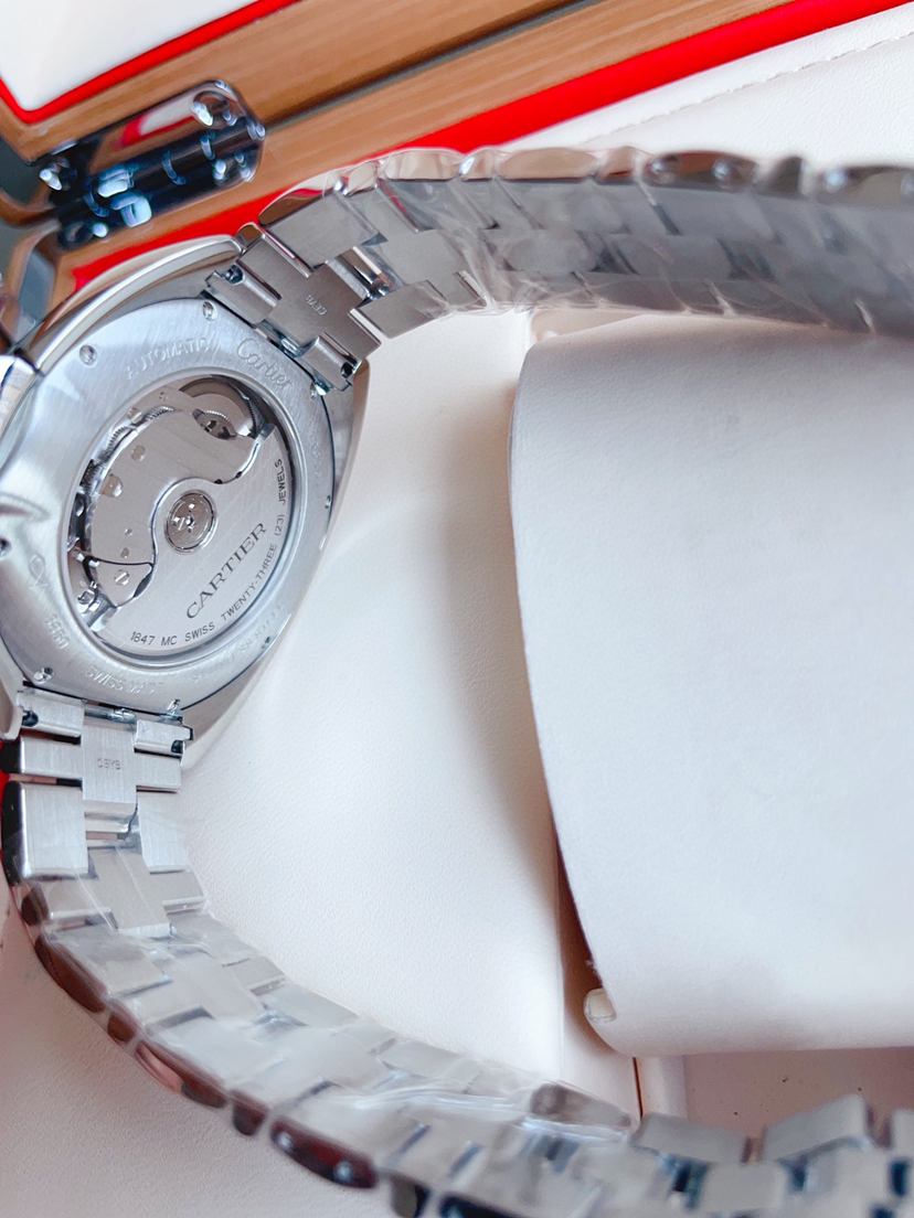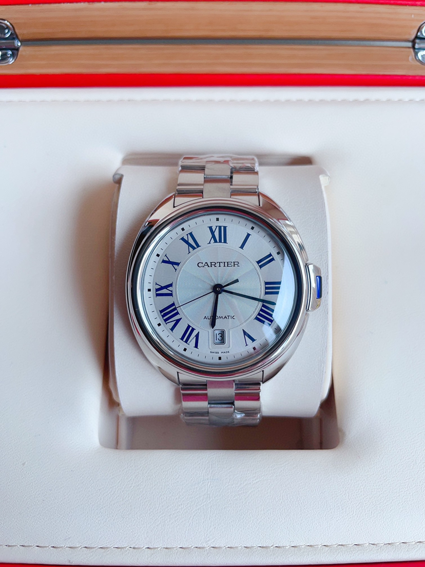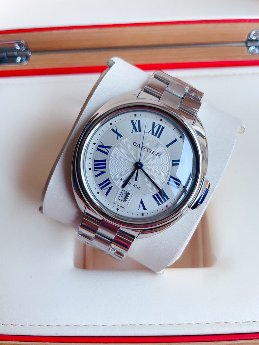 卡地亚钥匙系列 WSCL0007 男士腕表 自动机械 40mm表径 精钢材质 镀银雕纹太阳纹表盘 蓝钢剑形指针 钥匙形表冠 折叠扣 背透 日期显示 公价40500 ———顾客需知———