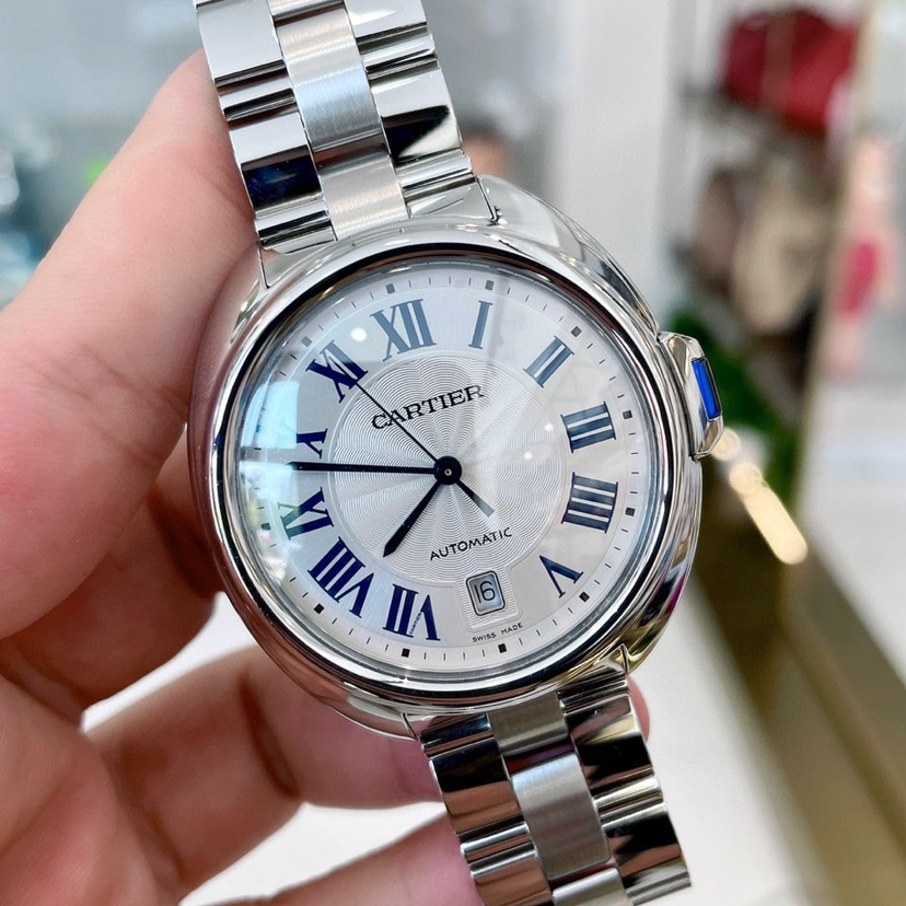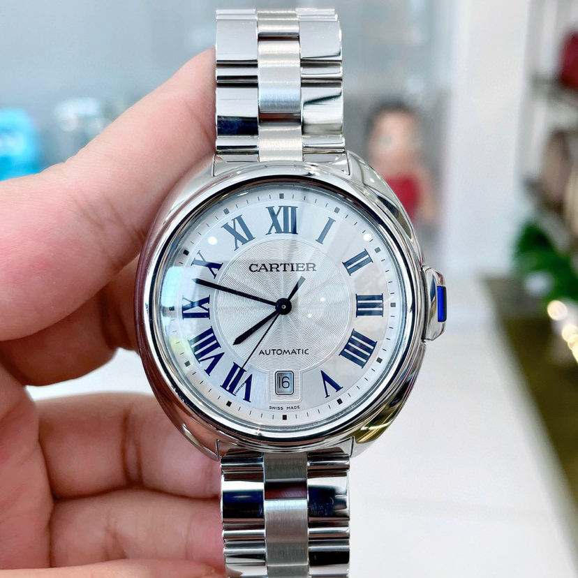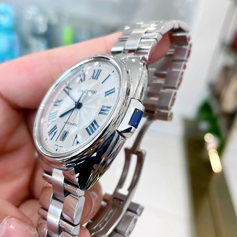 卡地亚钥匙系列 WSCL0007 男士腕表 自动机械 40mm表径 精钢材质 镀银雕纹太阳纹表盘 蓝钢剑形指针 钥匙形表冠 折叠扣 背透 日期显示 公价40500