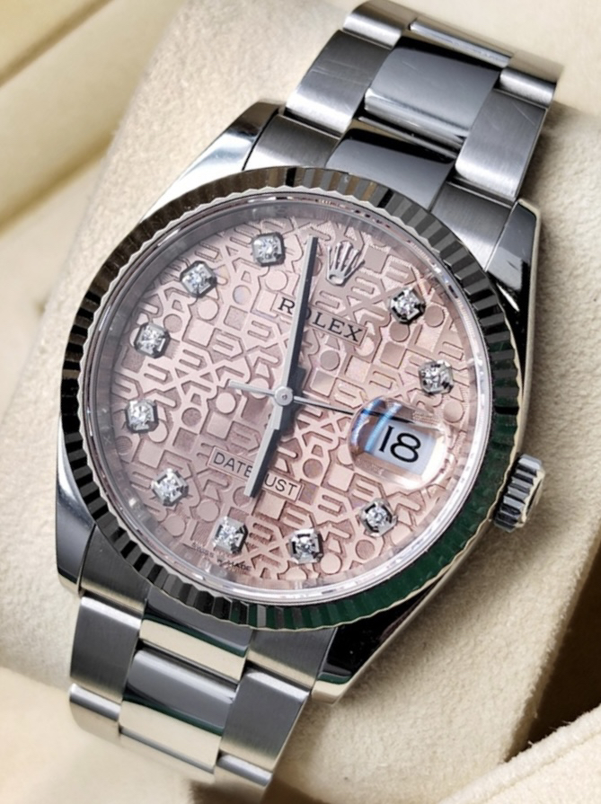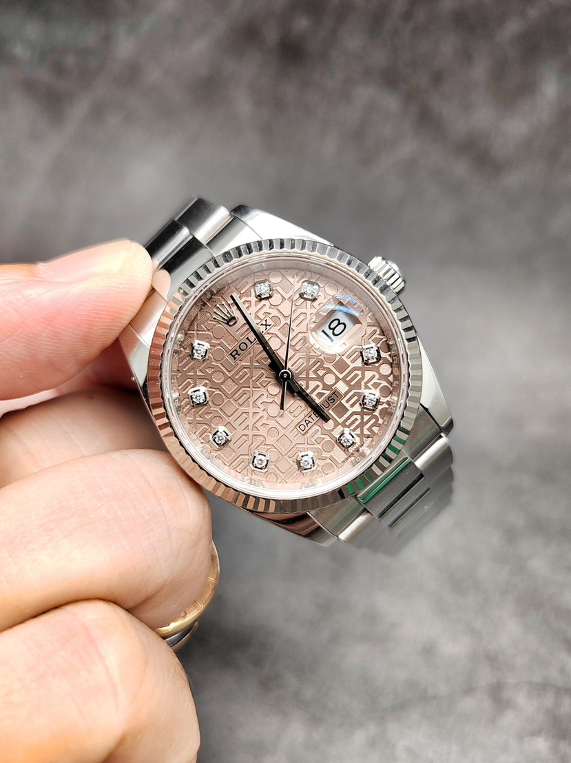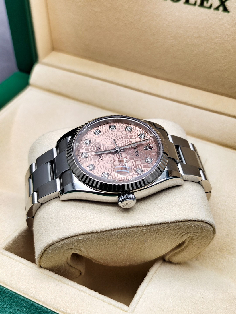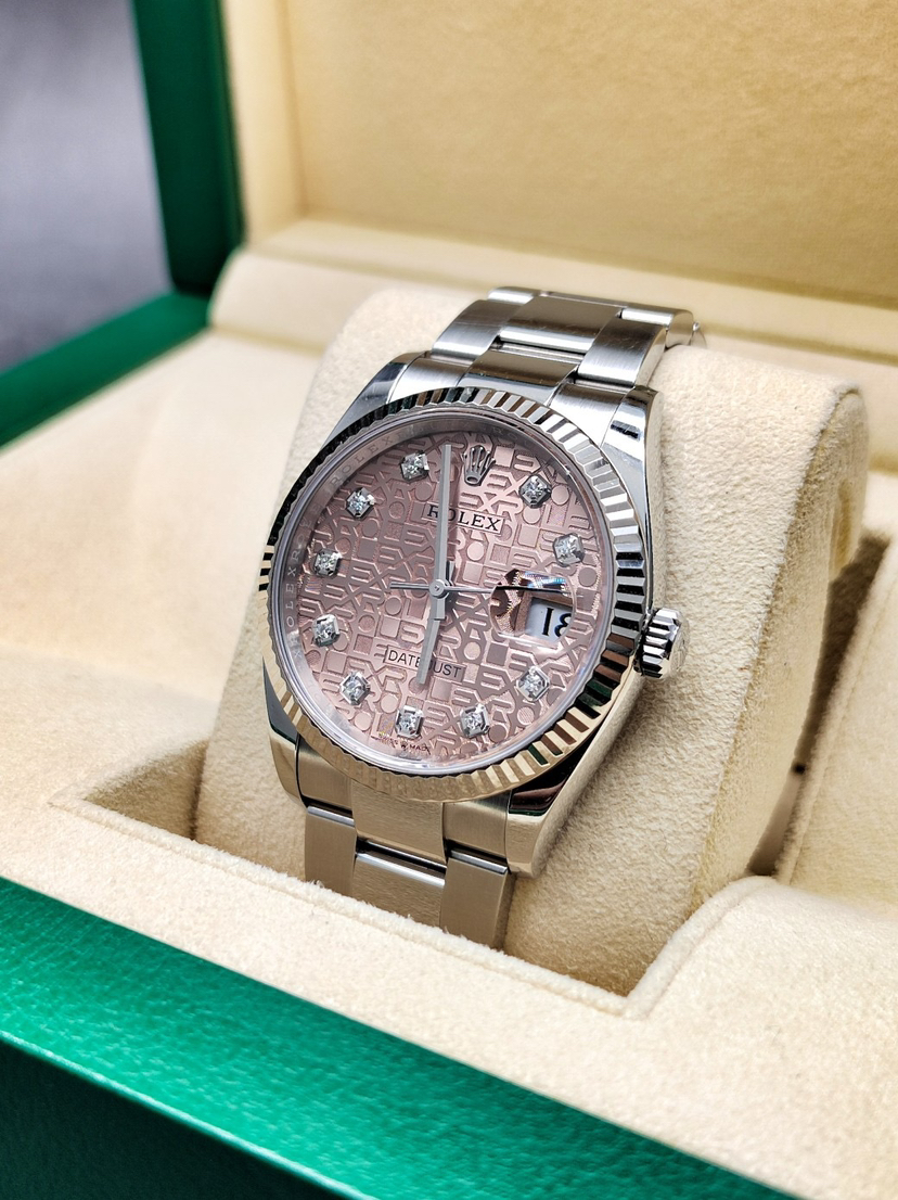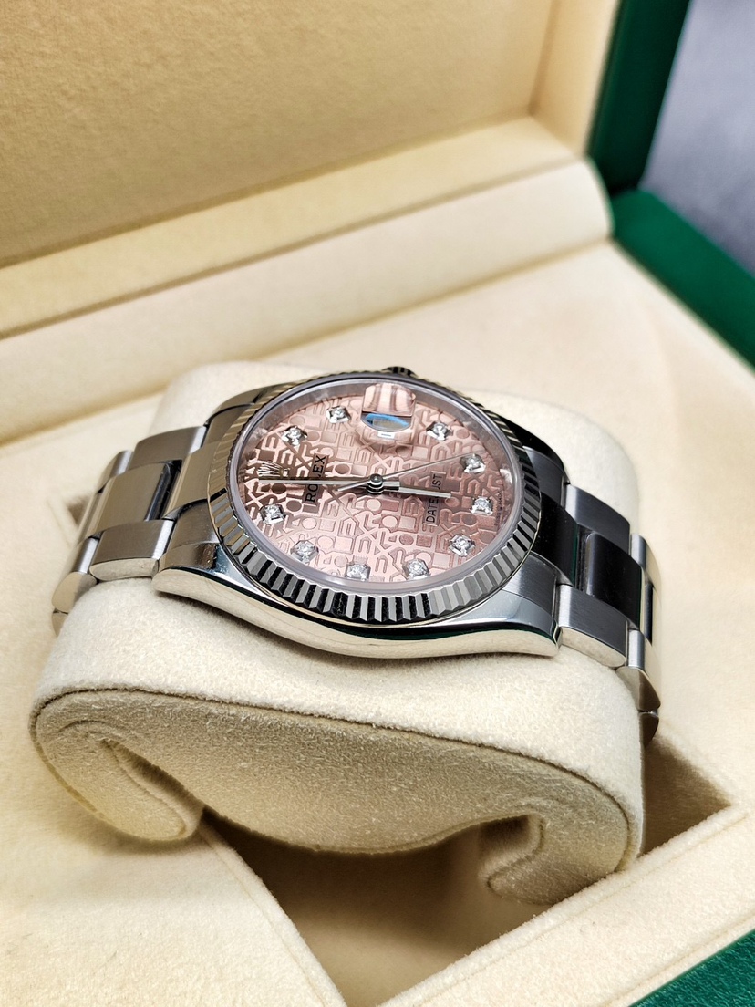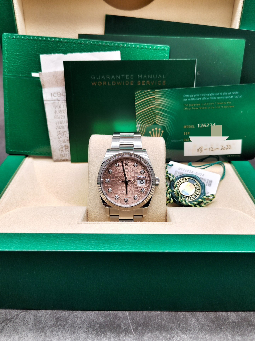 【20年新卡国行】劳力士126234-0024经典日志型,板带白金牙圈,很少见的粉钻电脑盘,36mm,2020年12月全套,10.5节表节,国行带小单,好成色,公价8万,我这好价