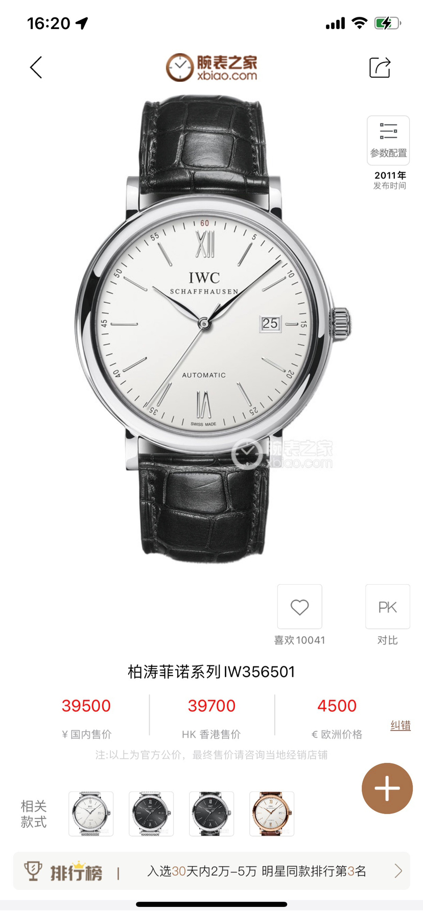 IWC/万国柏涛菲诺系列精钢自动机械男表 型号:IW356501 功能:日期显示 表径:40mm------专柜价:39500元