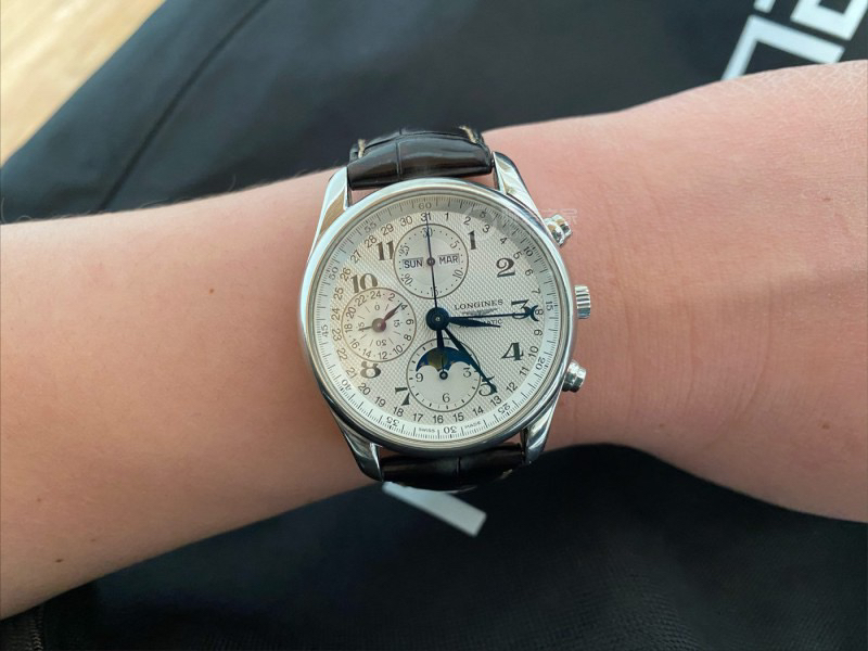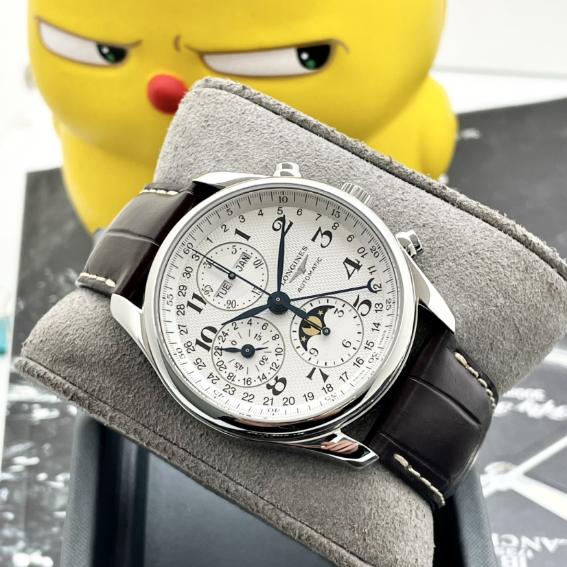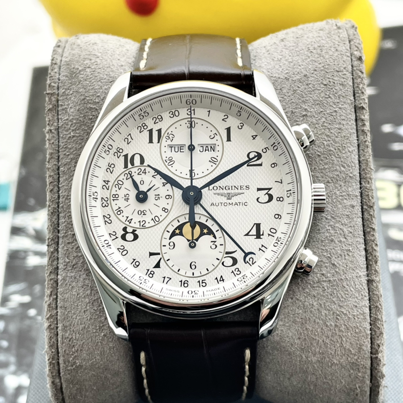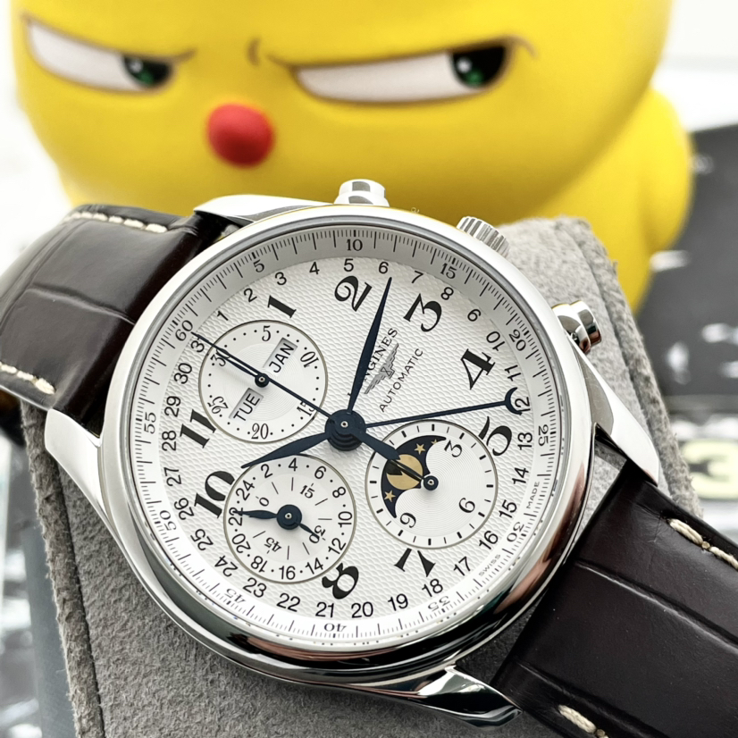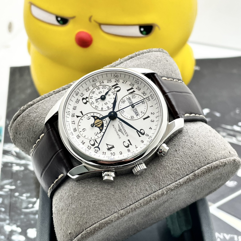 浪琴名匠八针月相计时码表,40mm表径,白面水波纹盘面,烤蓝指针,三眼计时表圈,星期、月份、指针式日历显示,布局设计精致,新款导柱轮,大热门款!