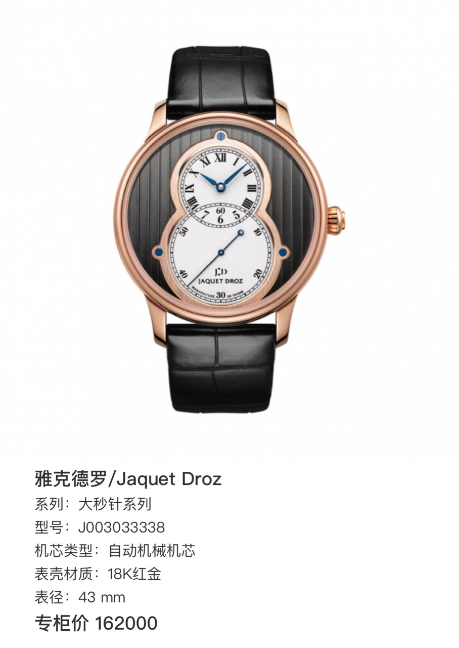 雅克德罗/Jaquet Droz 大秒针系列 J003033338 自动机械机芯 18K红金 43 mm 附件:极品全套 专柜价 162000