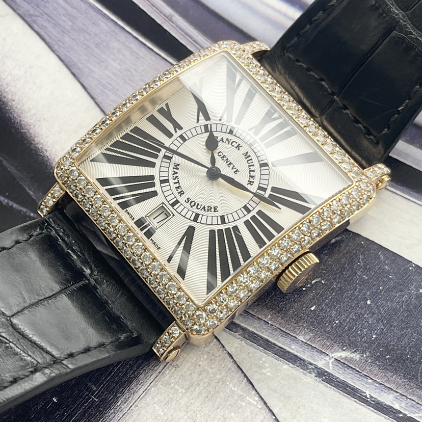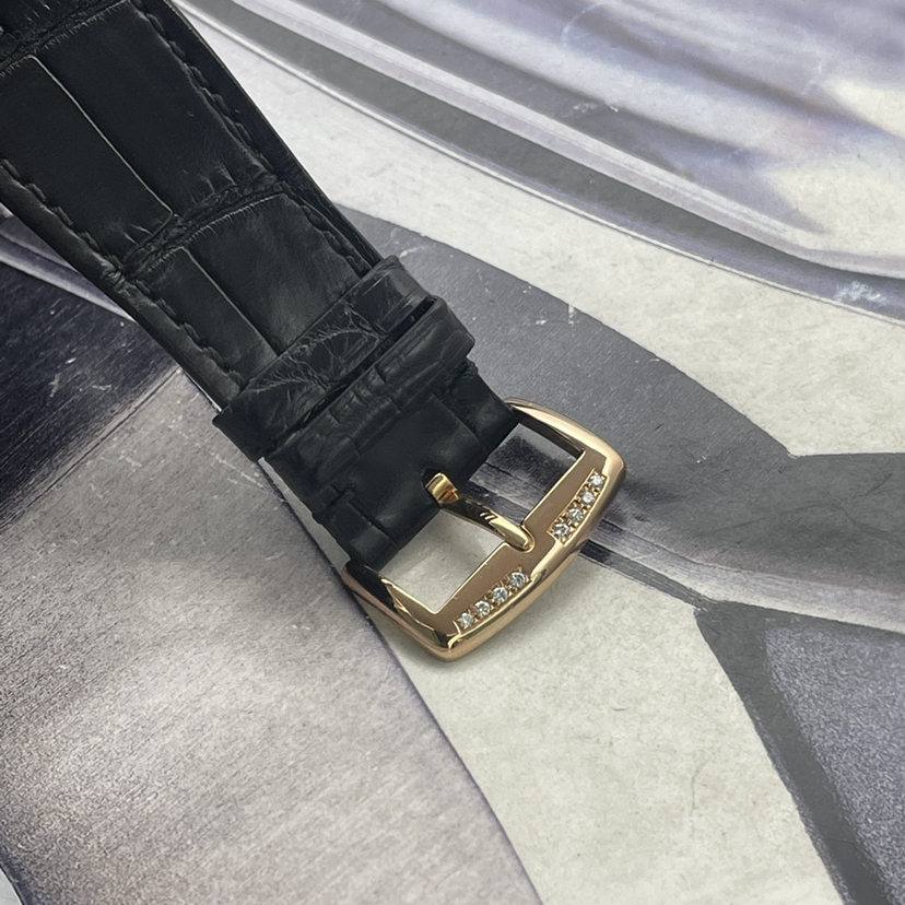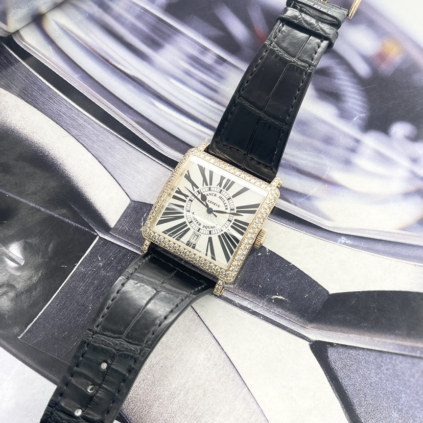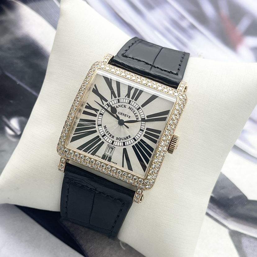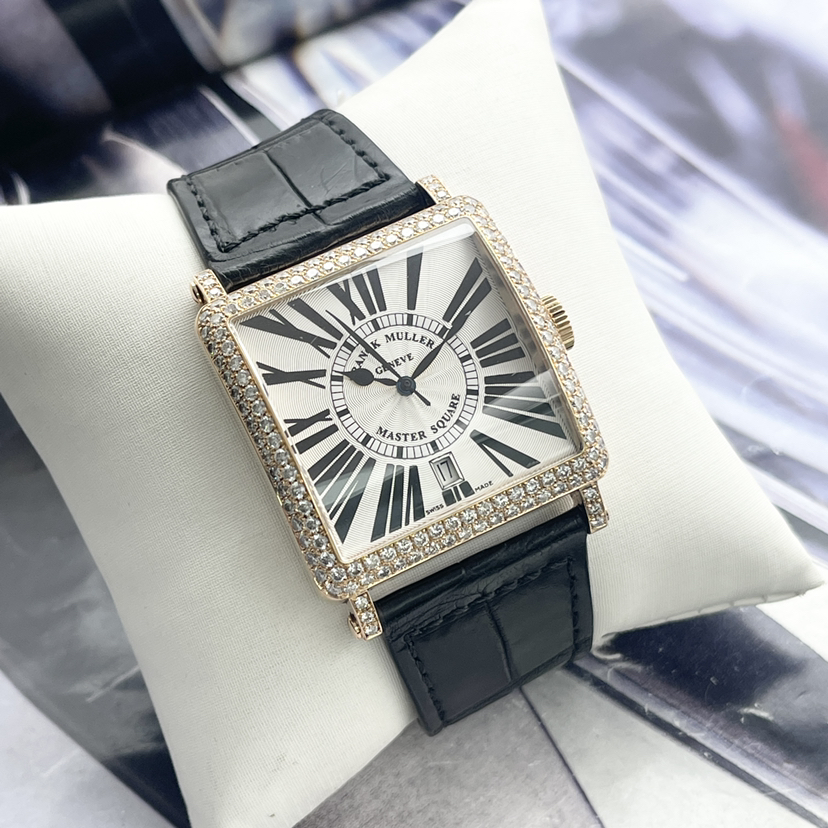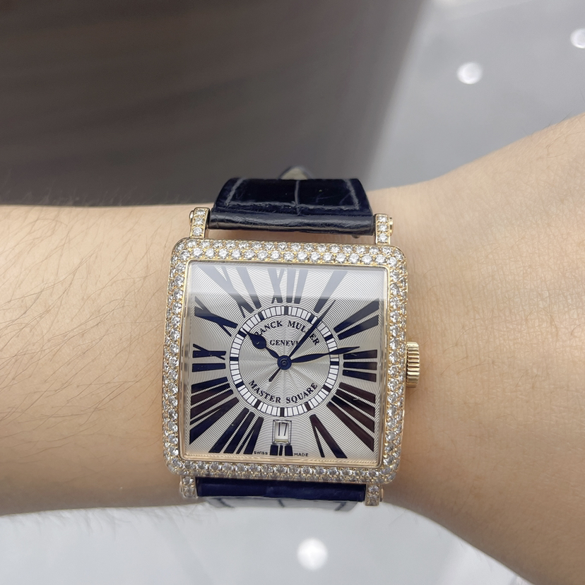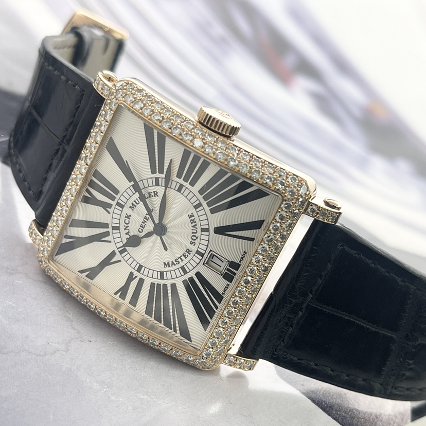 法穆兰方形通体18k玫瑰金材质,原镶钻,36.5×36.5方形表盘,小手腕也可以驾驭,6点位带日期窗,罗马数字刻度显示,高调也不失优雅!