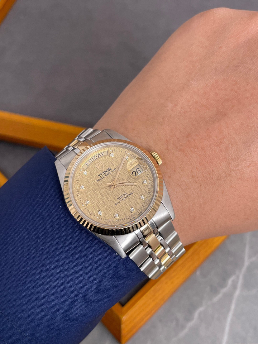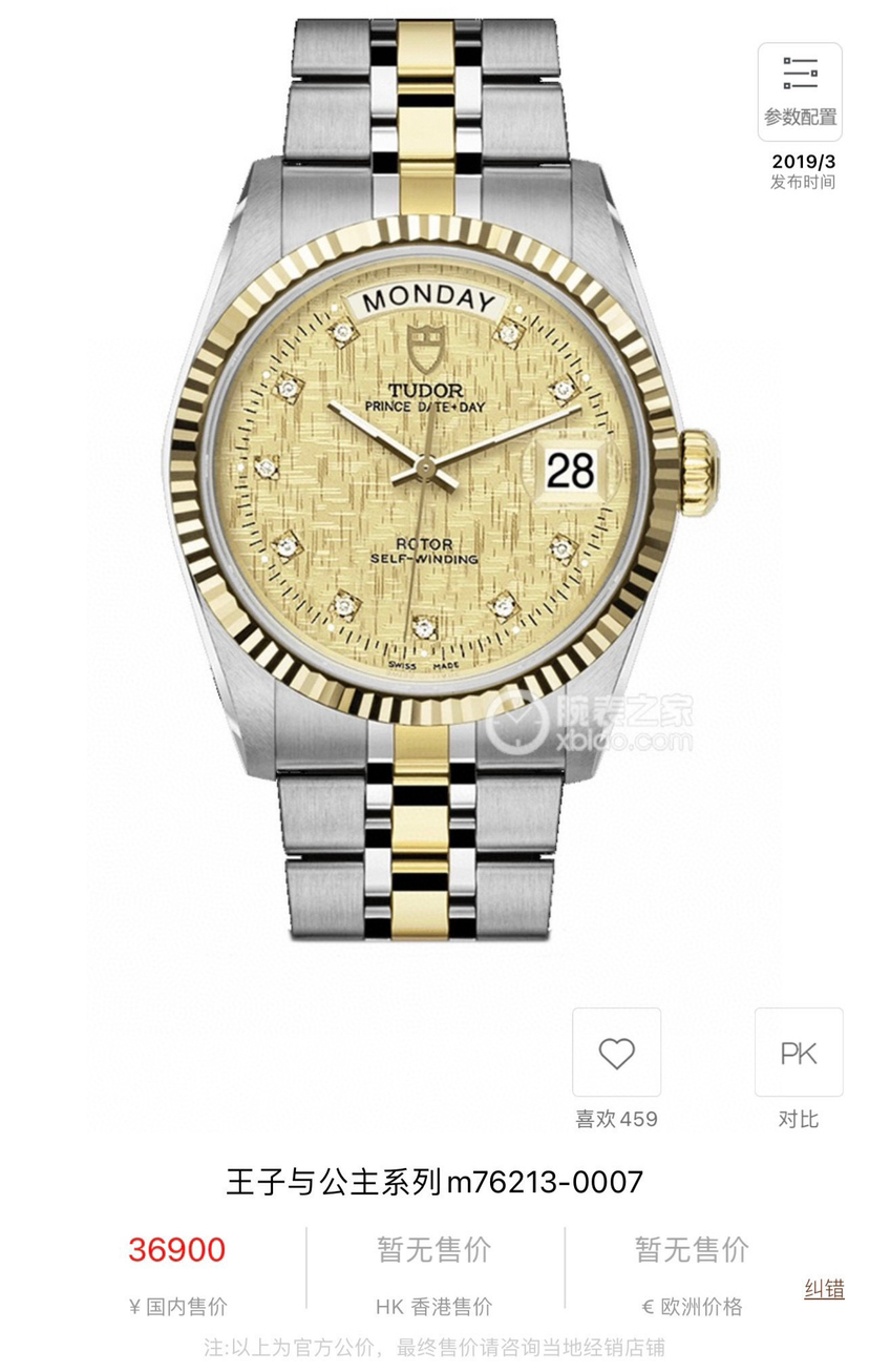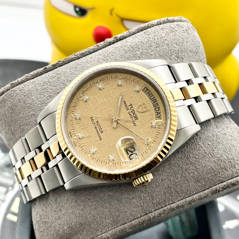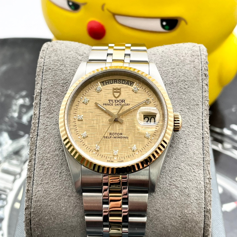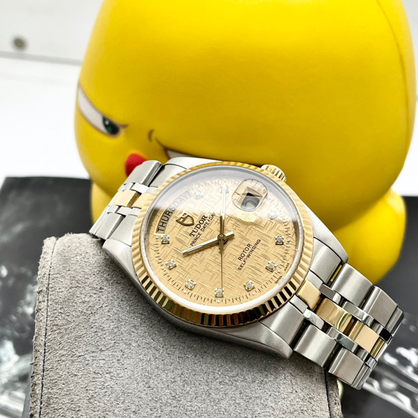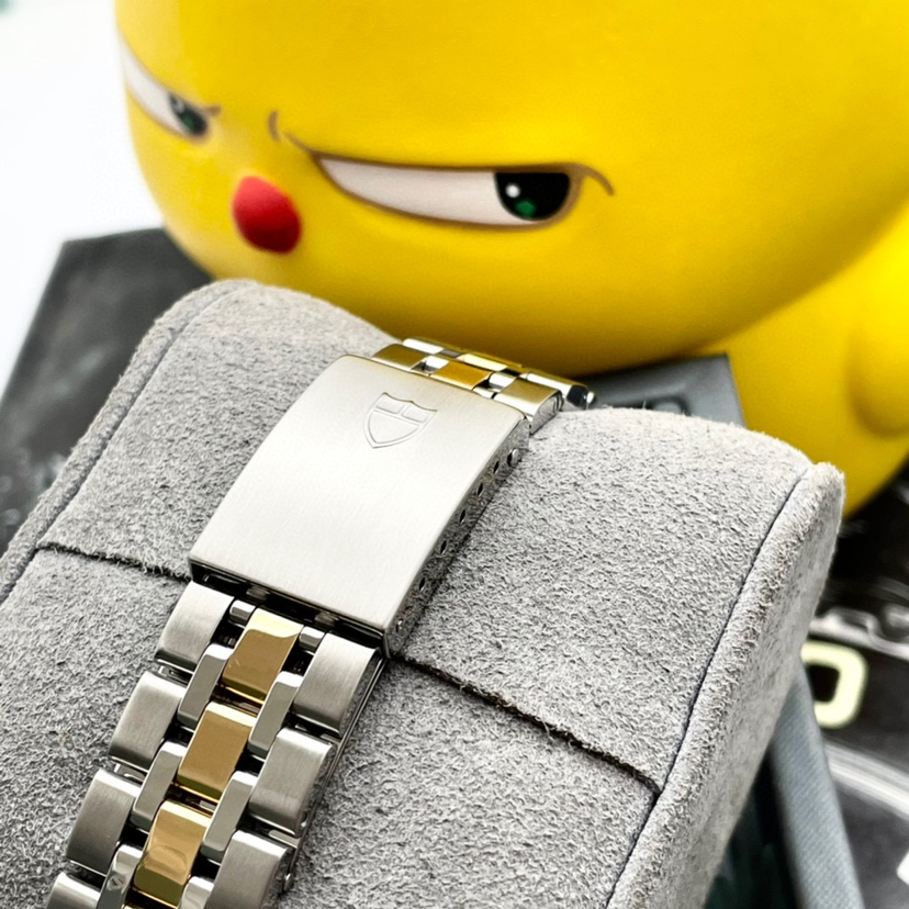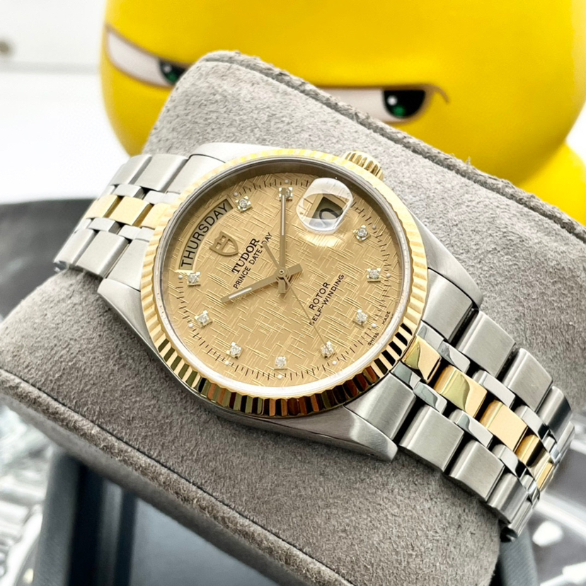 帝舵王子,间18K黄金材质,香槟色布纹表盘,经典大方,原镶时标钻,双历显示,有金有钻,好表好寓意,好价值得拥有!