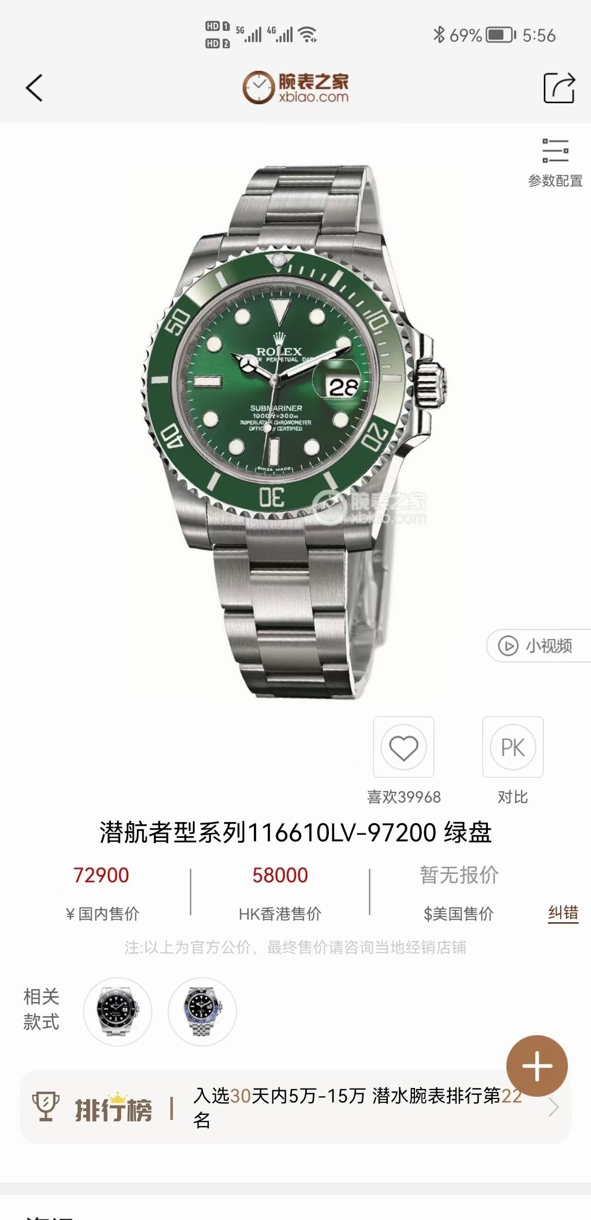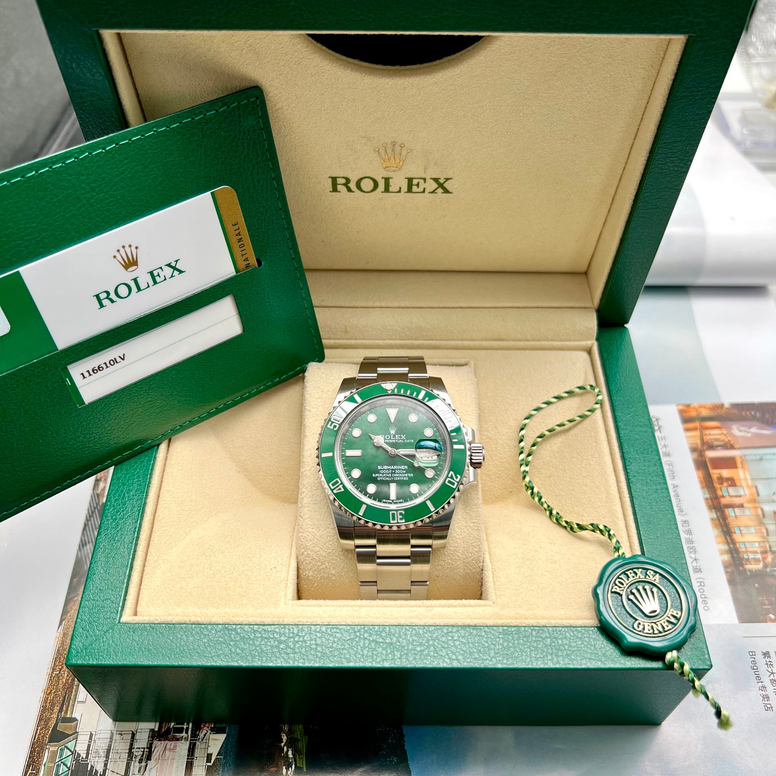 劳力士 潜航者系列 型号:116610LV 绿面(简称绿水鬼)材质:精钢 镜面:蓝宝石水晶玻璃。表扣:折叠表扣 机芯:自动机械机芯 表径:40mm 成色:97新。附件:19年盒证。公价:72900。保修:一年。现好价出