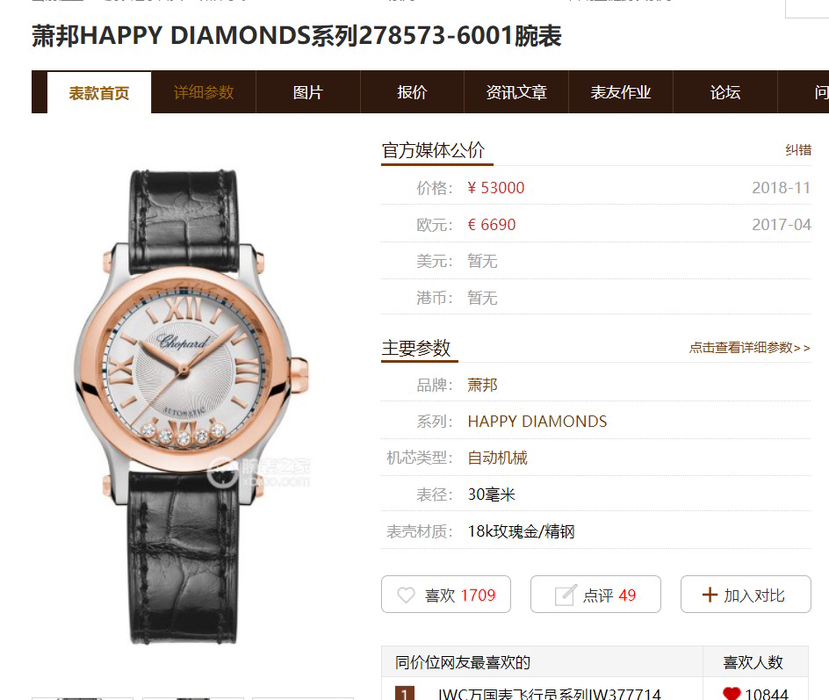 萧邦/Chopard Happy Diamonds系列 278573-6001 自动机械机芯 18k玫瑰金/精钢 30.00 mm 专柜价 53000