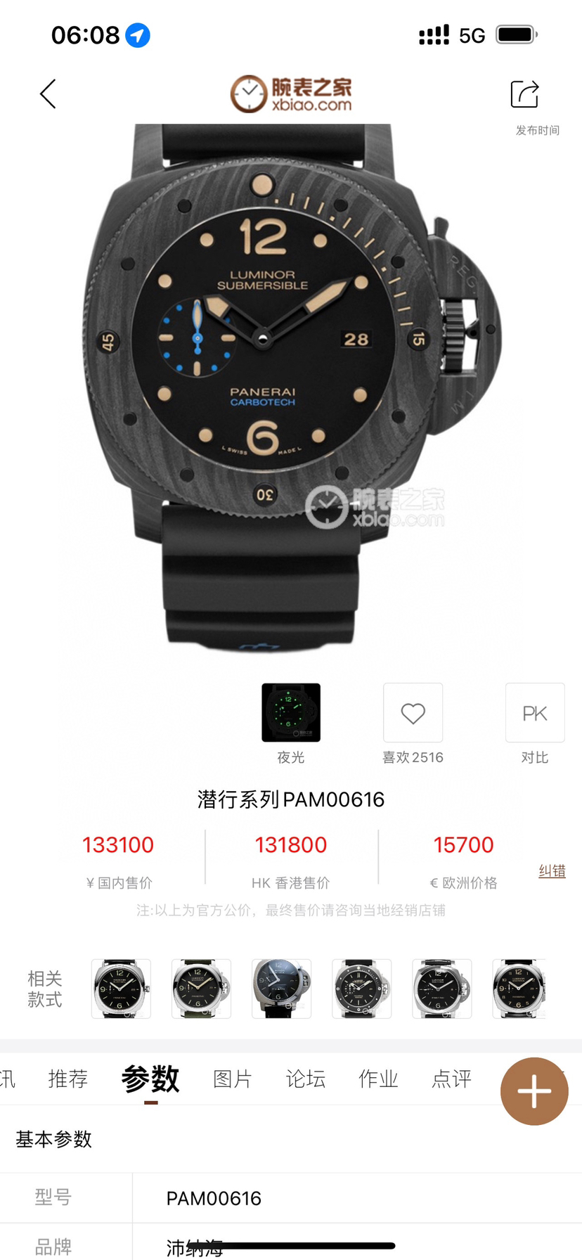 沛纳海SUBMERSIBLE系列自动机械PAM00616男士腕表,全球限量500枚,钛金属涂层材质,日期显示,小秒盘,表径47mm,工价133100,现货好价51500