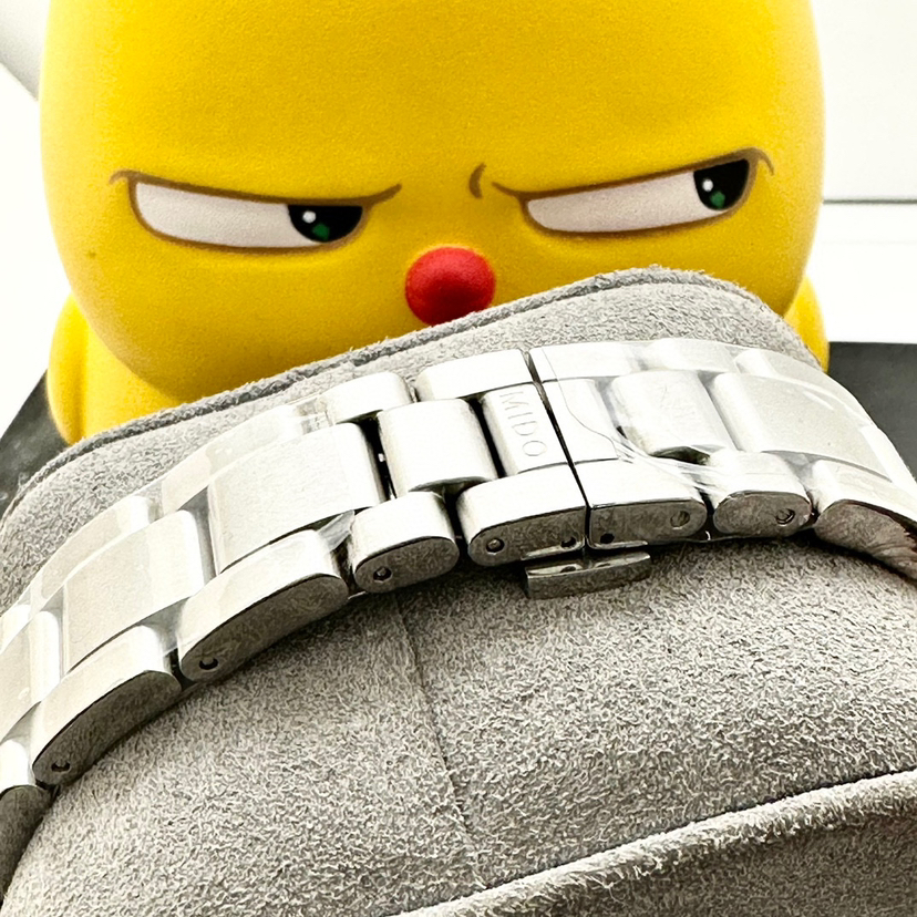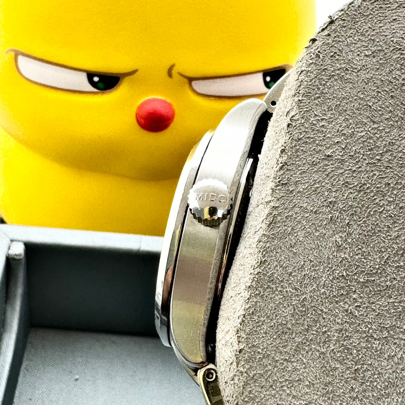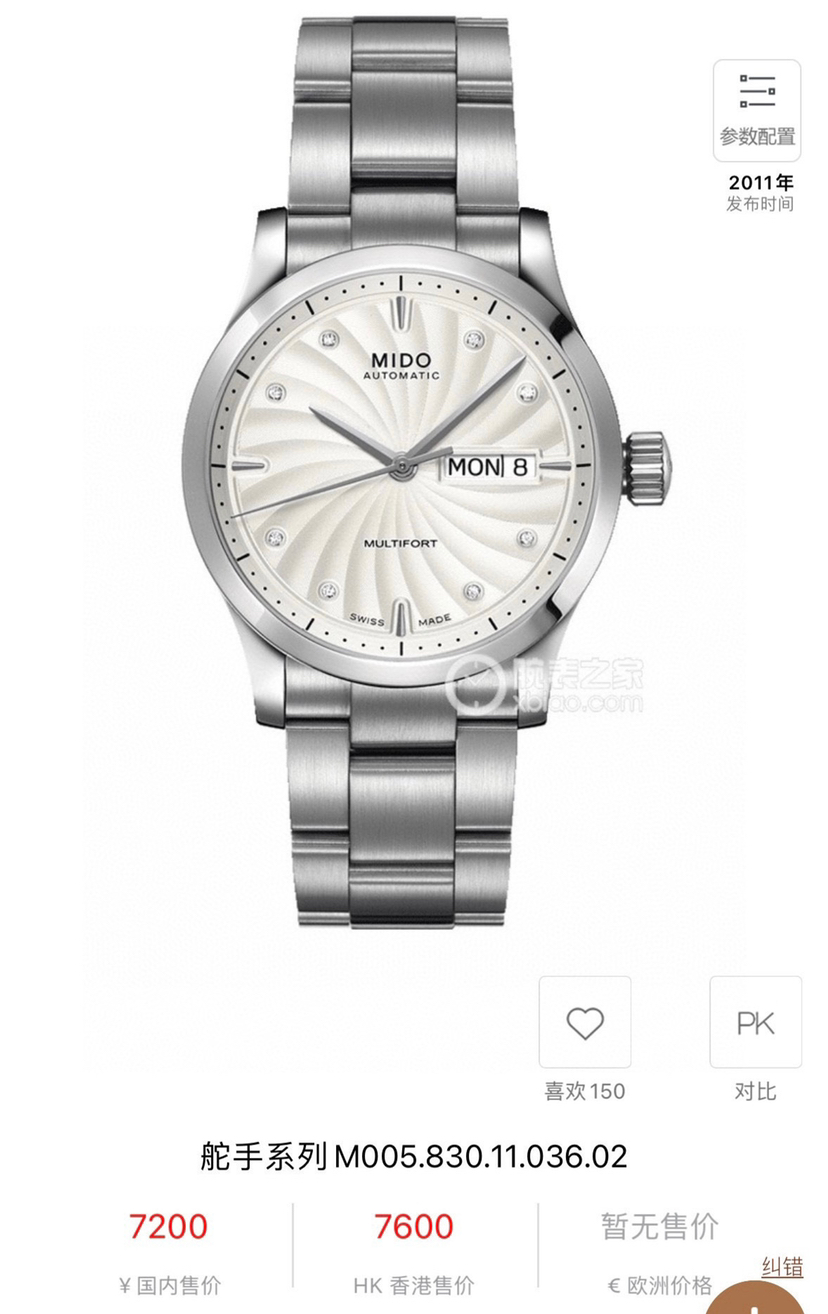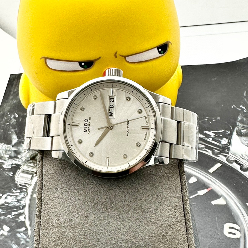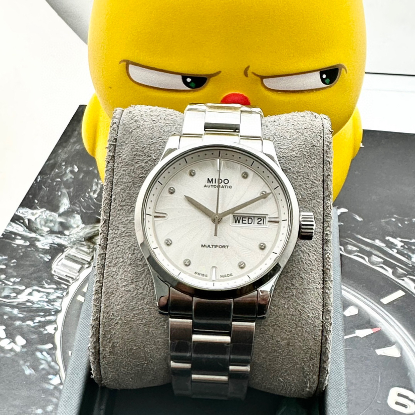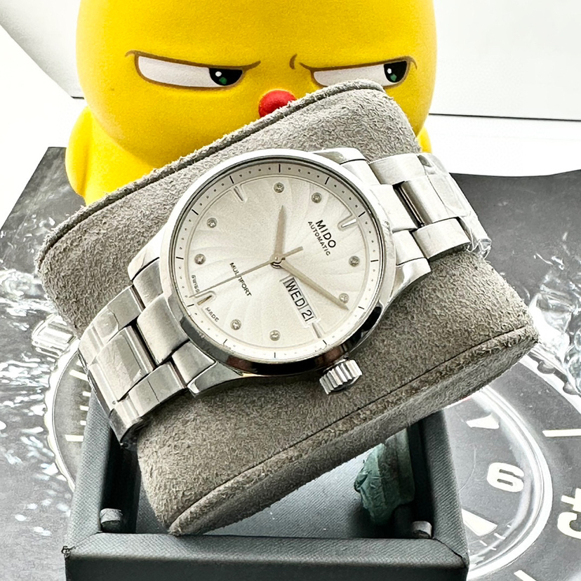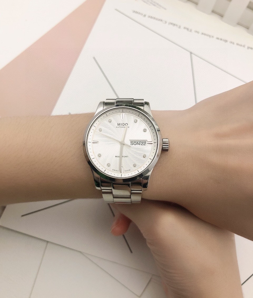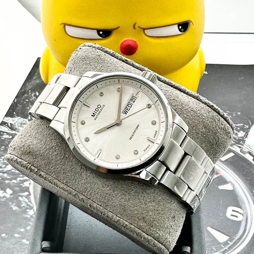美度舵手系列,自动机械男士腕表,38mm表径,不锈钢材质,白色表盘有放射状纹饰,镶嵌钻石时标,三点钟位置有日期和星期显示,可正装可休闲!