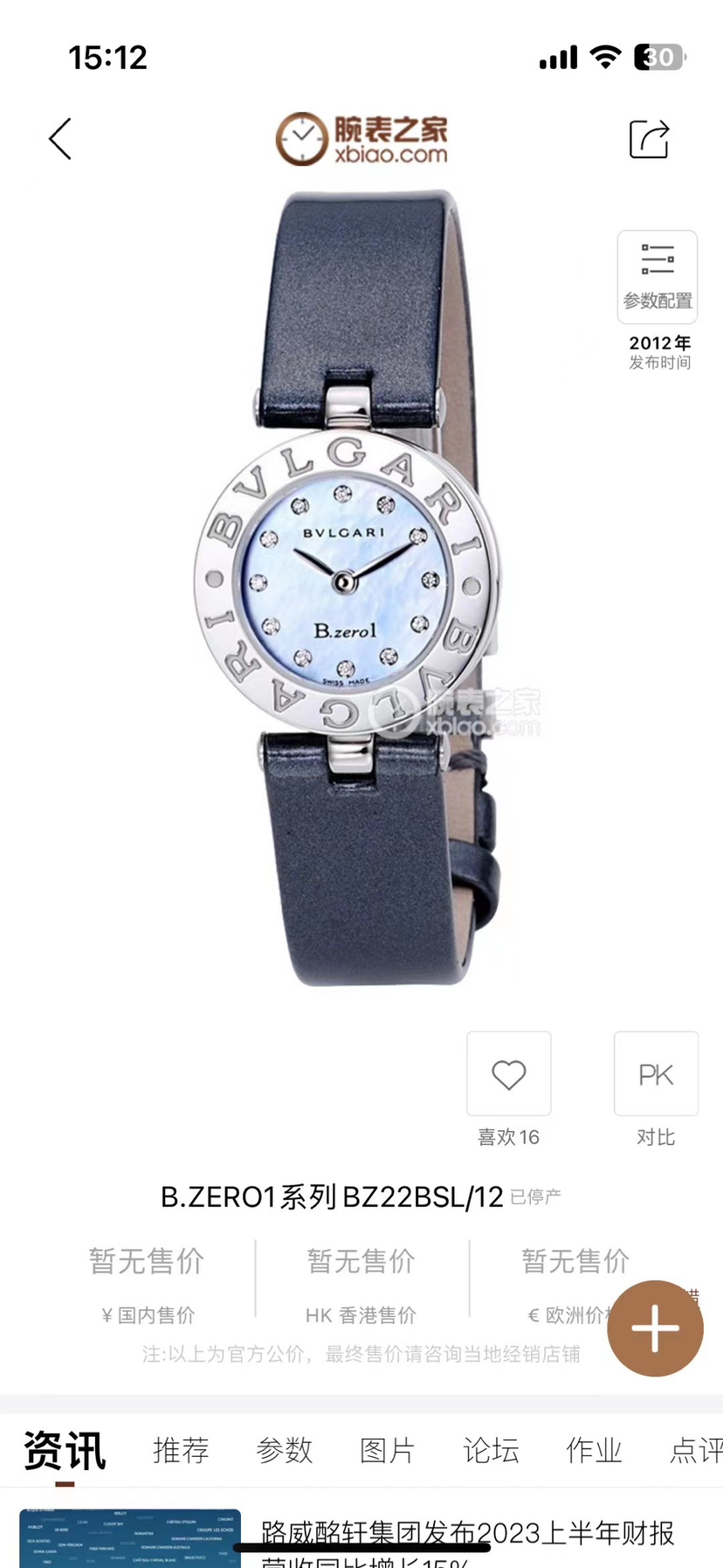 宝格丽 B.ZERO1系列 型号BZ22BSL/12 女士22mm石英腕表 不锈钢材质表壳 少见蓝贝母钻刻 折叠扣 单表一支 公价24500 现货单表好价