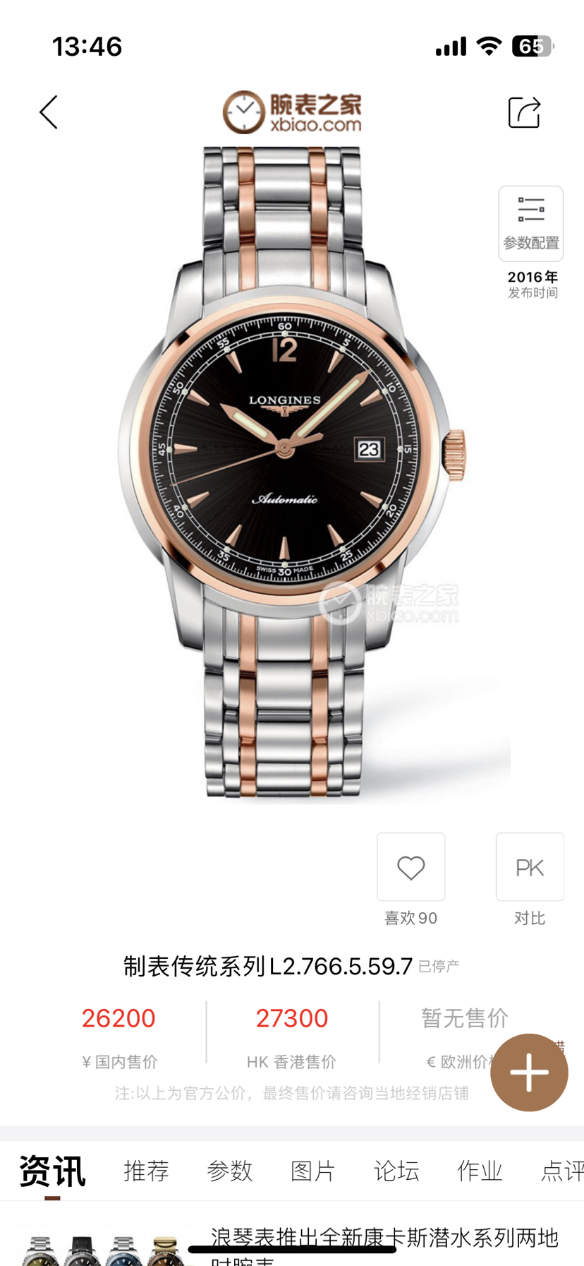LONGINES 浪琴索伊米亚系列L2.766.5.59.7自动机械男士腕表,精钢/18K玫瑰,41MM表径,日期显示,公价26200,现货全套好价