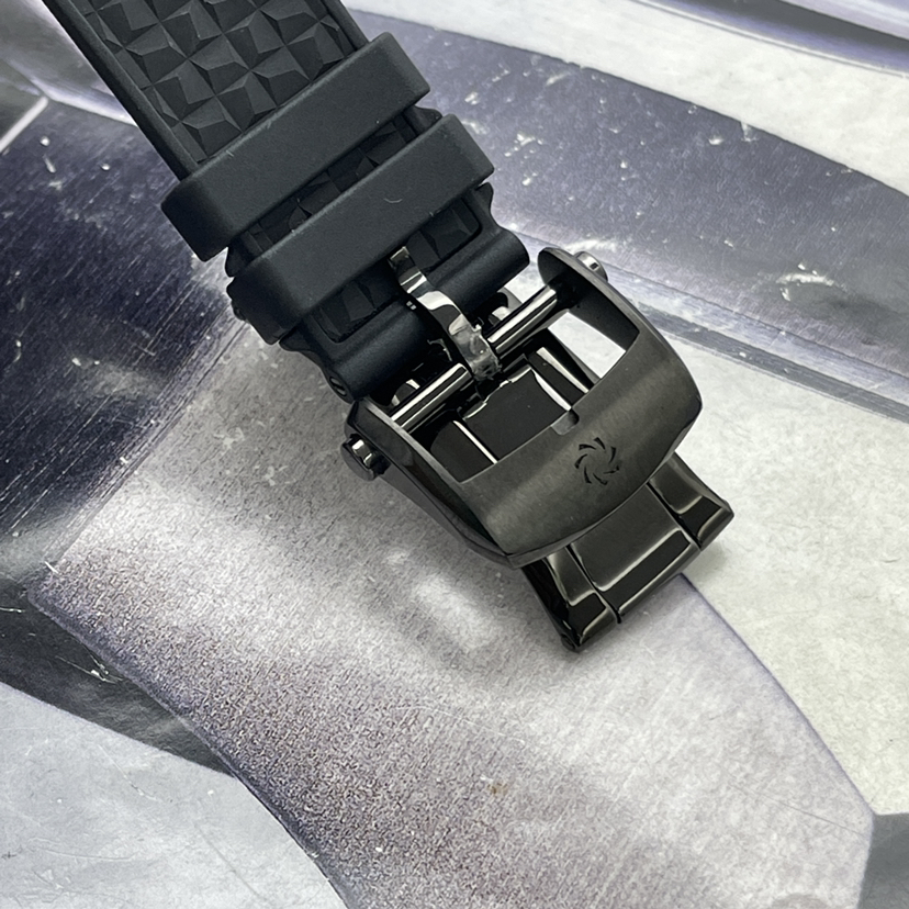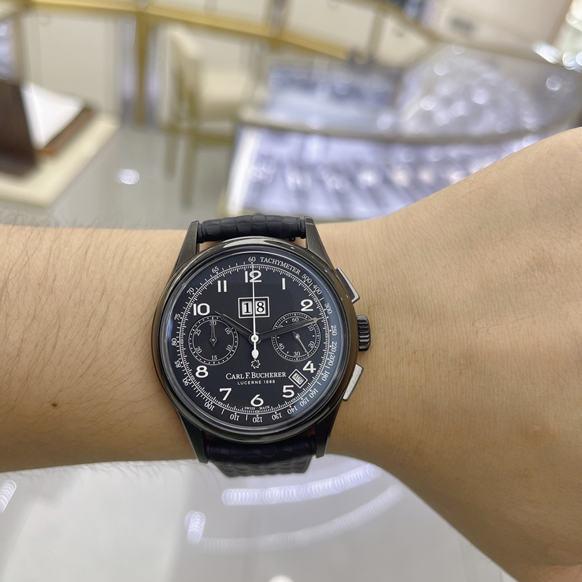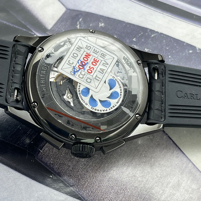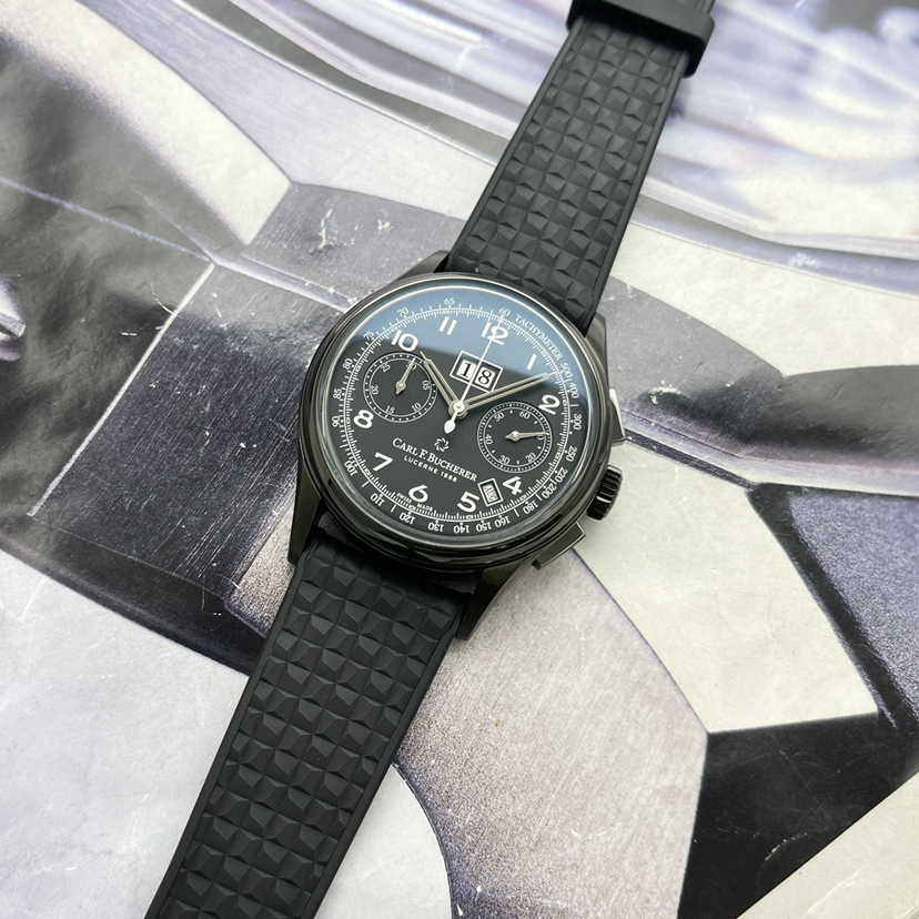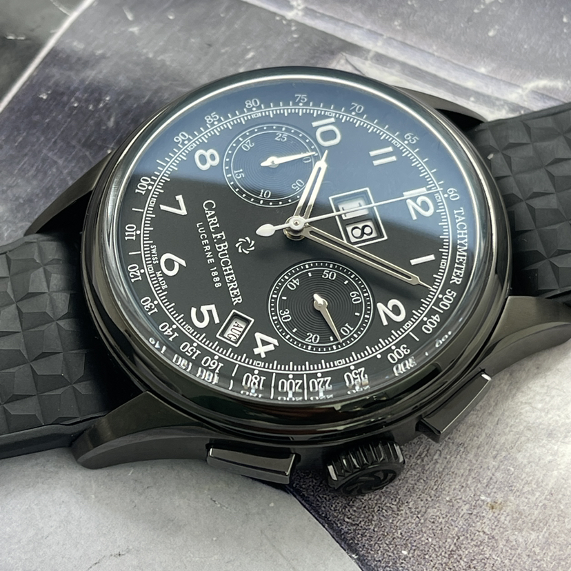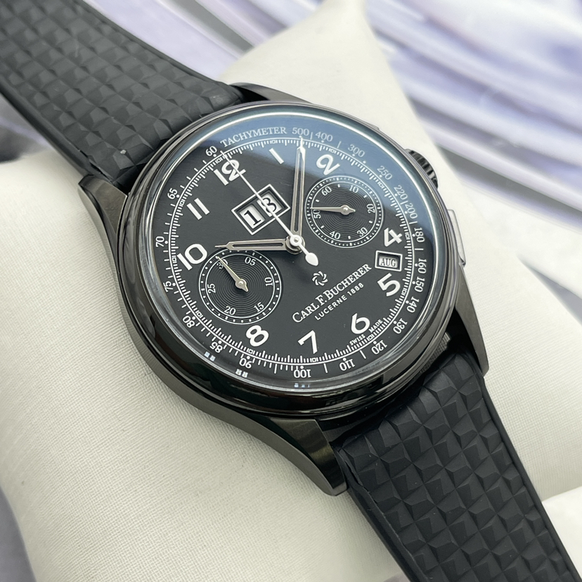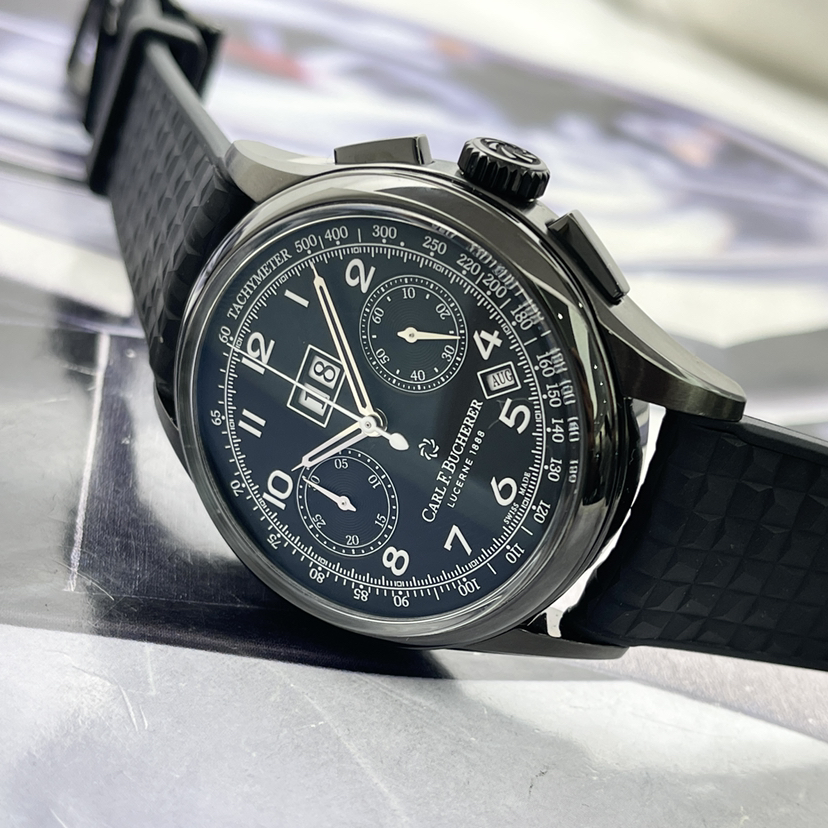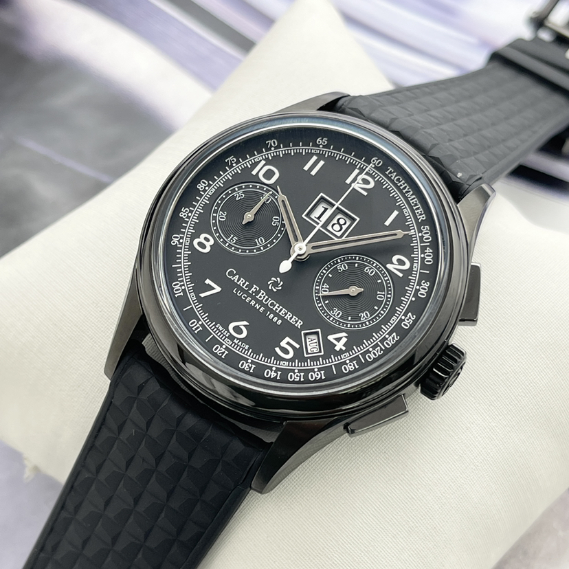 宝齐莱传承系列,自动机械男士腕表,41表径,精钢表壳覆以 DLC 类钻碳涂层,深黑色哑光表盘,搭配白色阿拉伯数字,镀铑楔形指针,年历显示,大日历,计时功能,酷感黑色表盘搭配利落剪裁西装,一举一动,施展万变莫测的深邃引力。