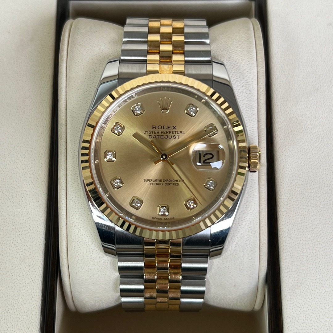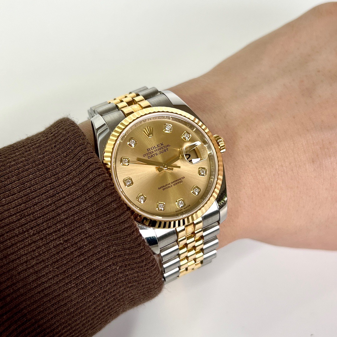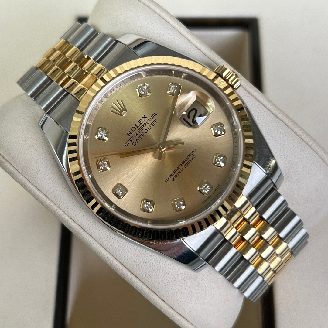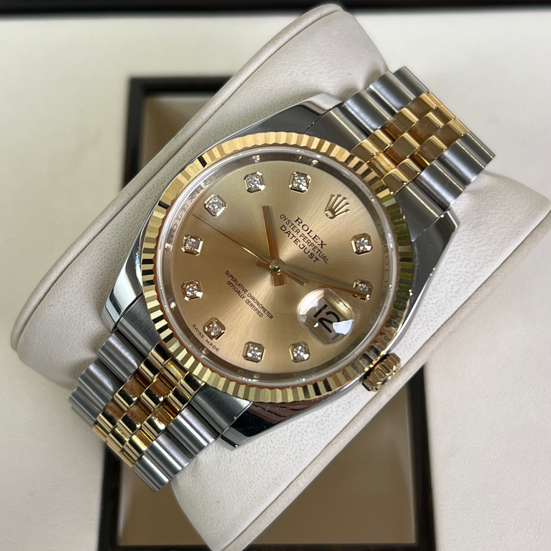 劳力士日志型系列116233香槟盘镶钻腕表,36mm表径,自动机械,该款腕表采用36毫米直径设计,经典低调,十颗镶钻时标在香槟色的盘面上闪闪发光。