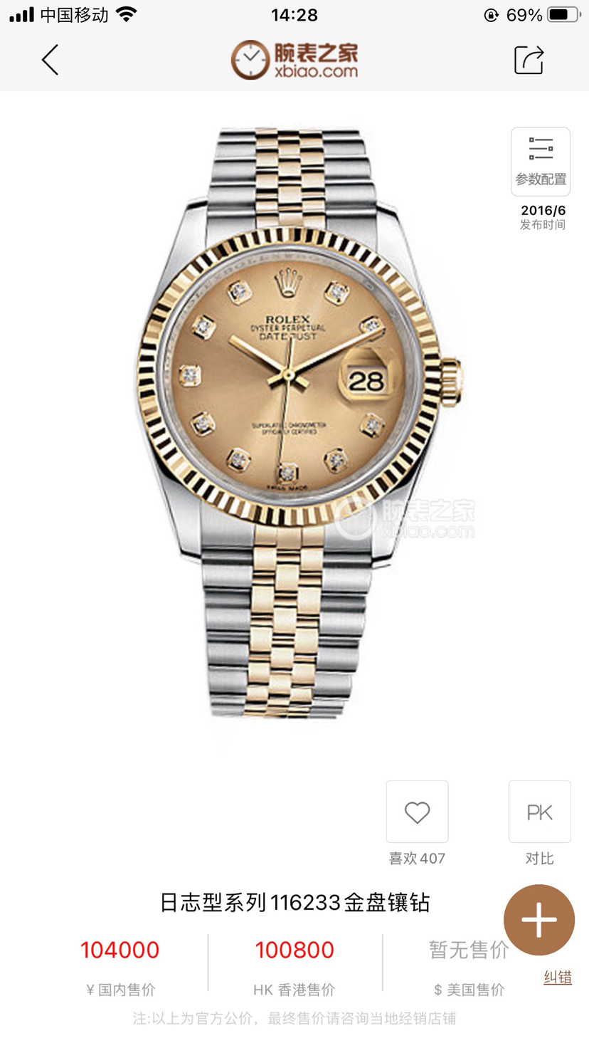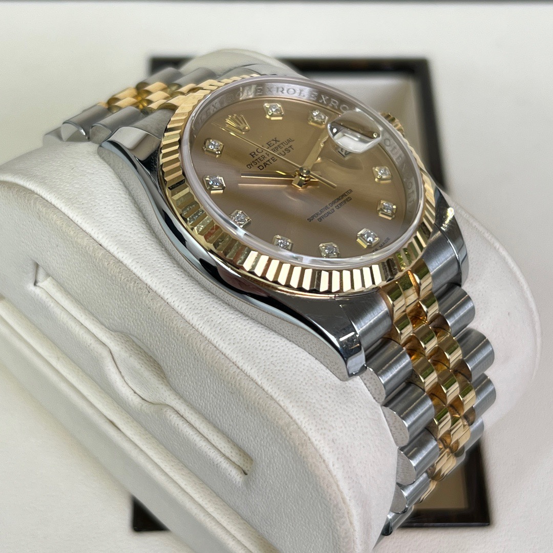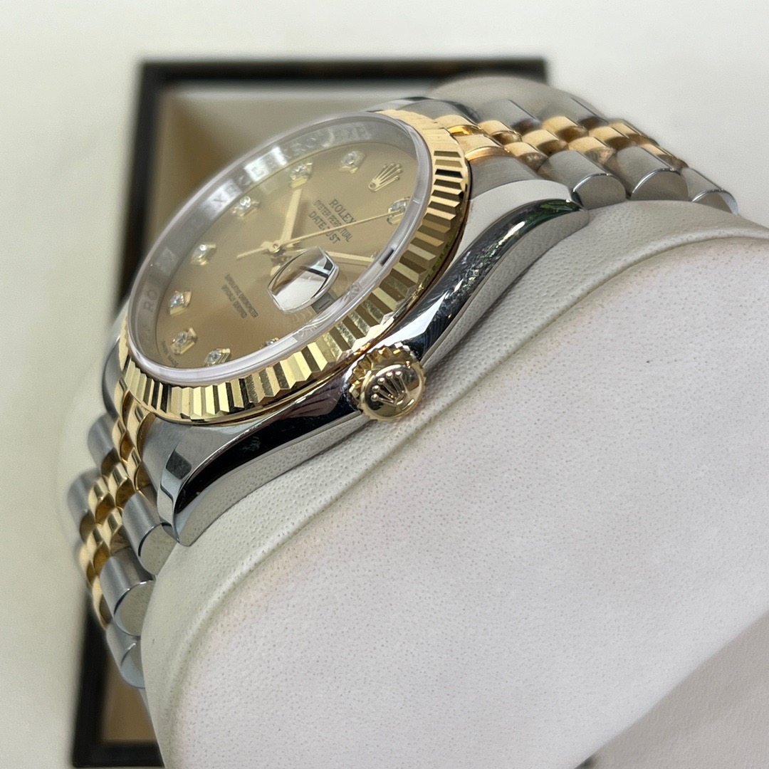 劳力士日志型系列116233香槟盘镶钻腕表,36mm表径,自动机械,该款腕表采用36毫米直径设计,经典低调,十颗镶钻时标在香槟色的盘面上闪闪发光。