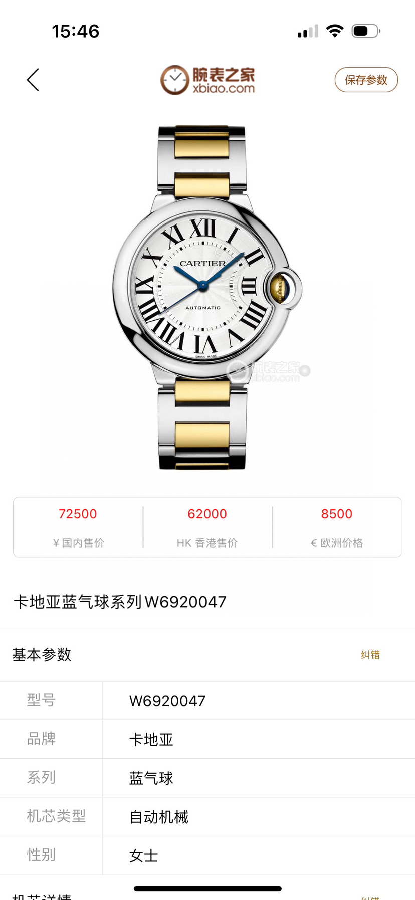 卡地亚蓝气球BALLON BLANC DE CARTIERW6920047机械女性