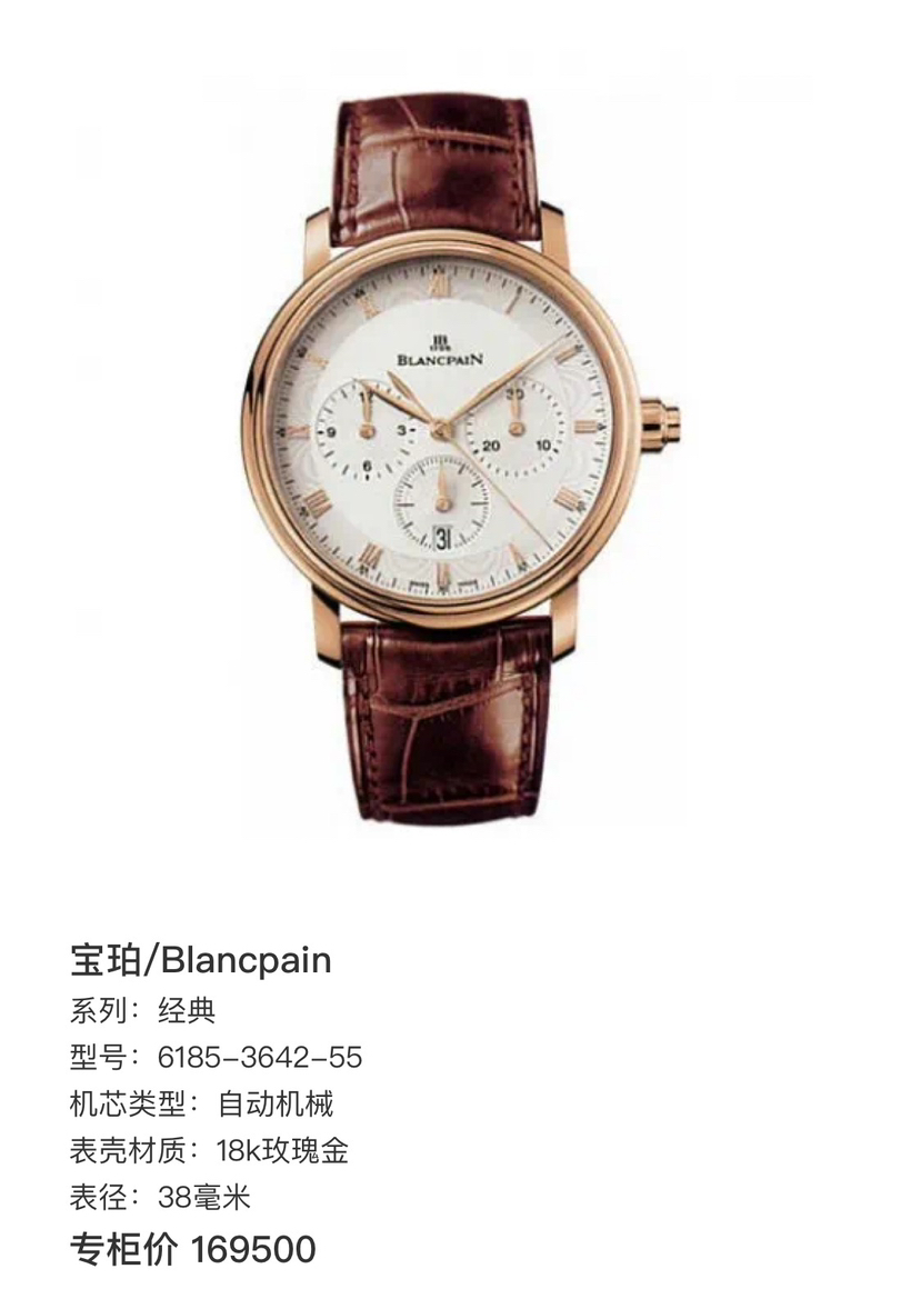 宝珀/Blancpain 经典 6185-3642-55 自动机械 18k玫瑰金 38毫米 专柜价 169500