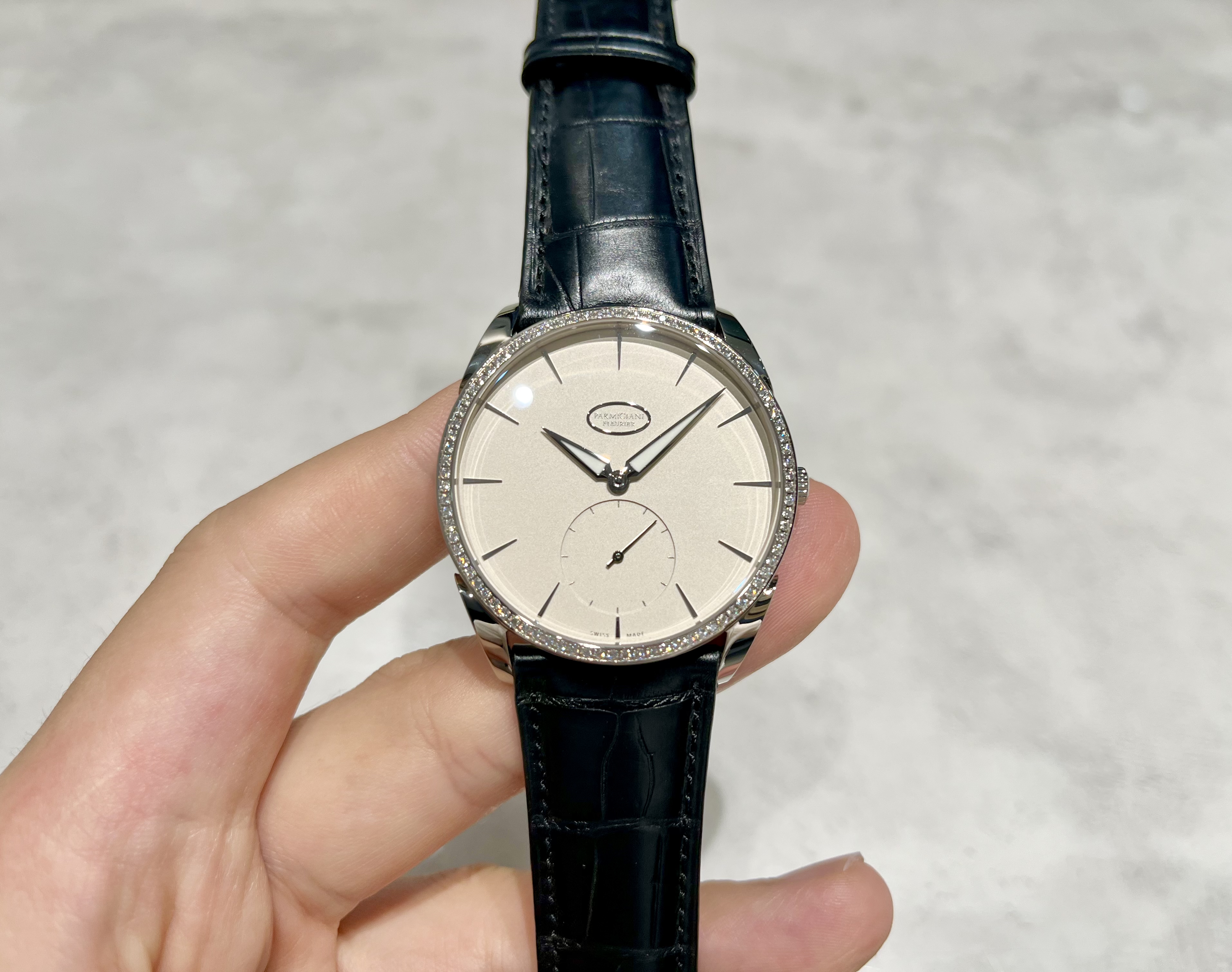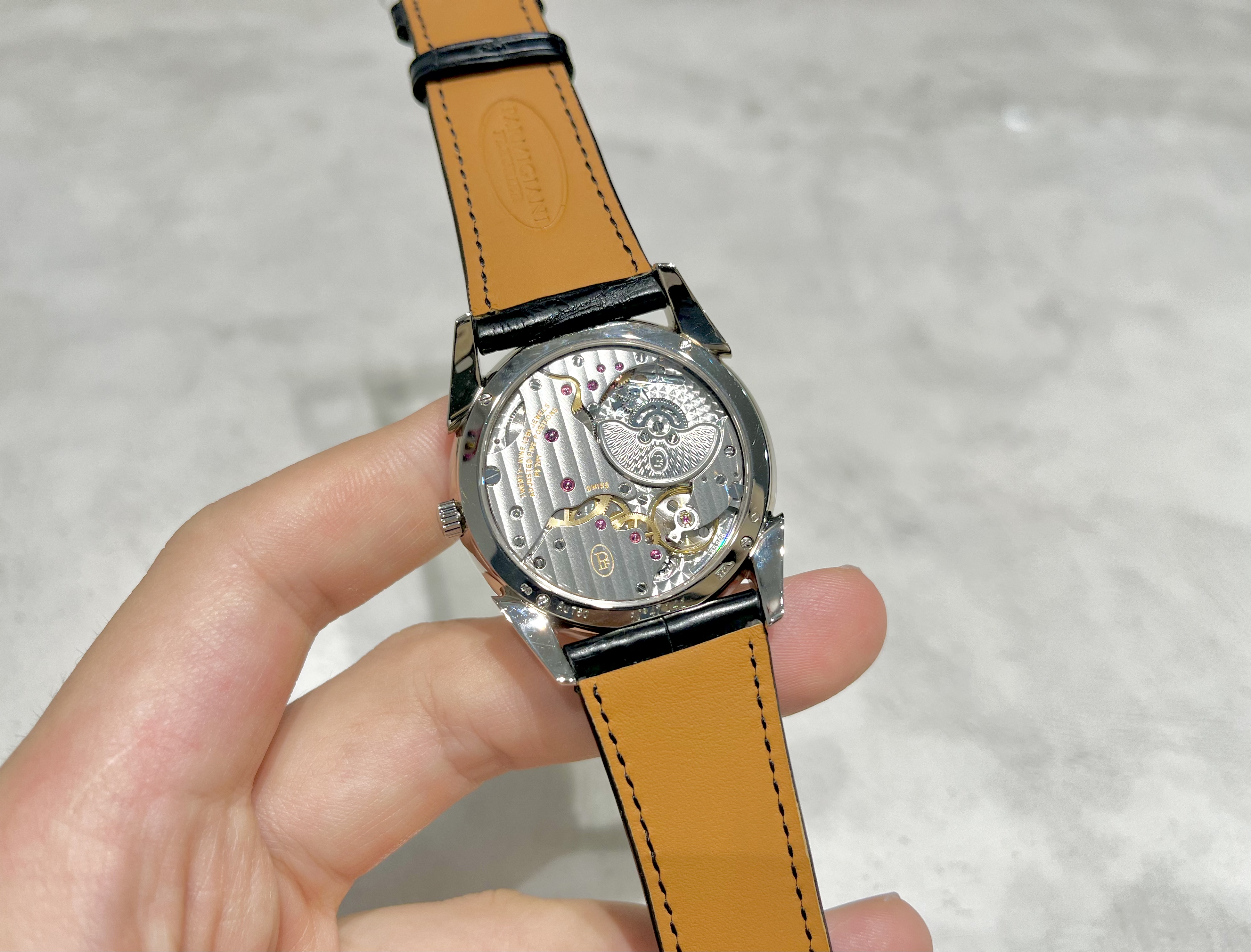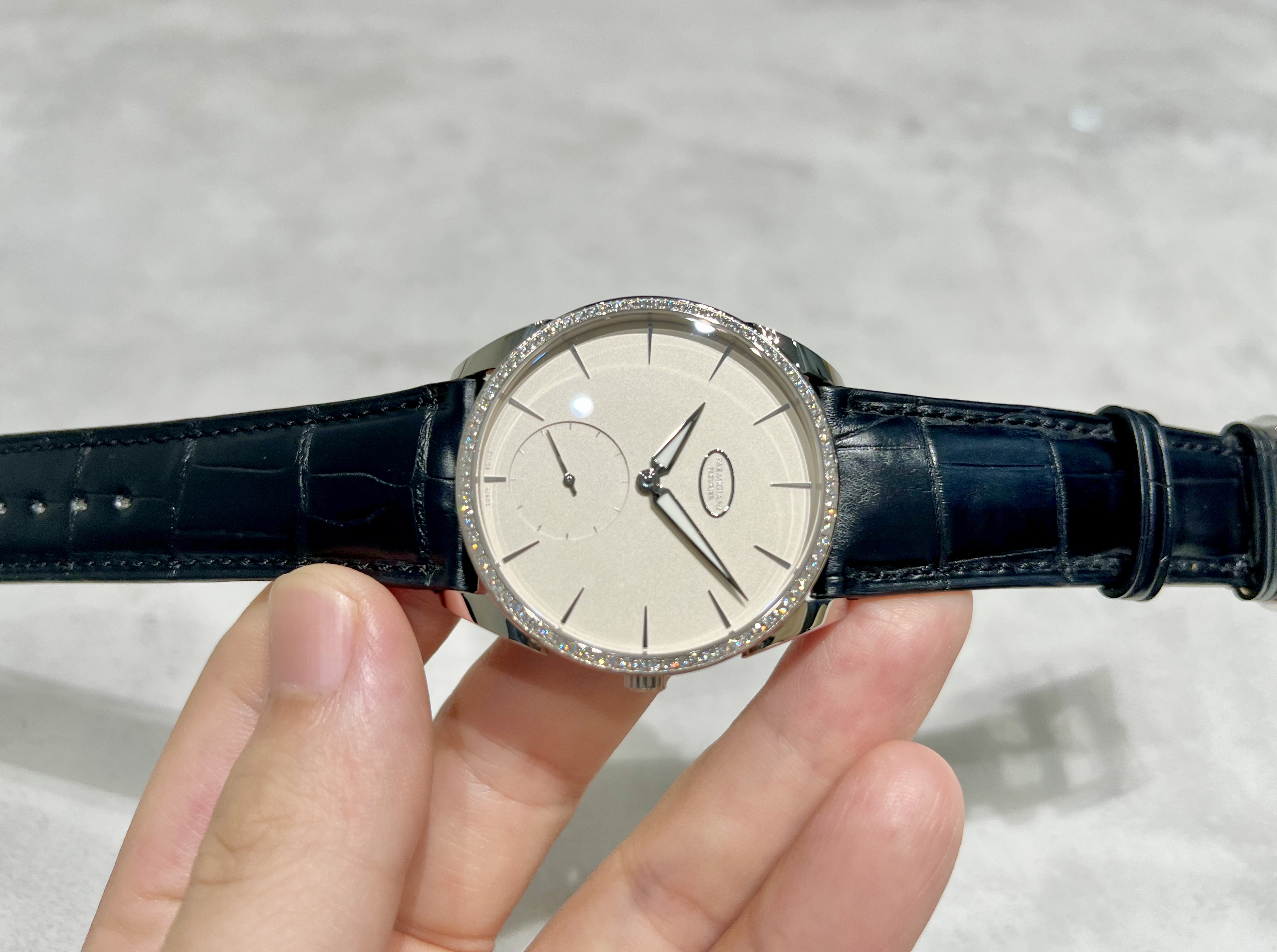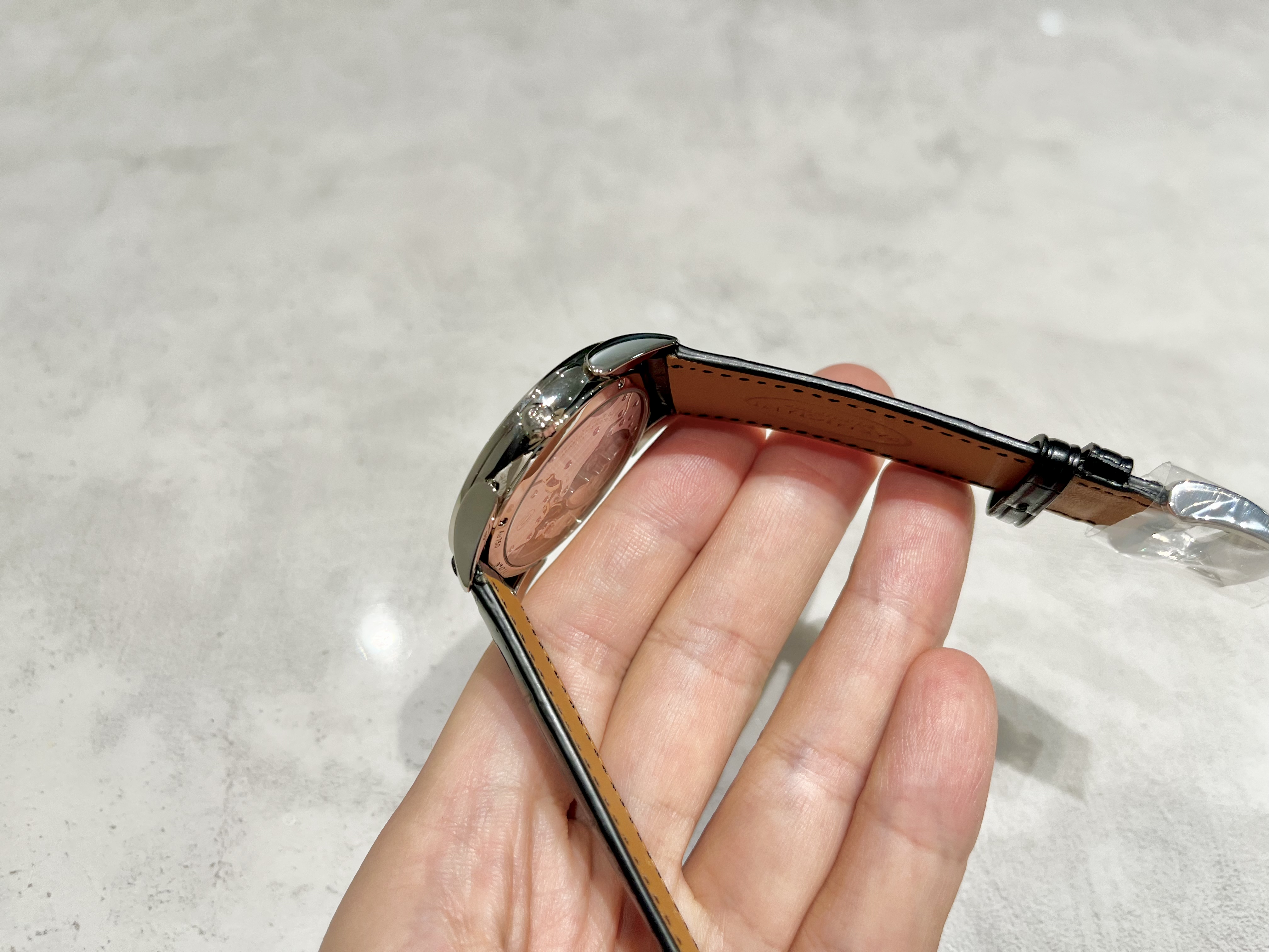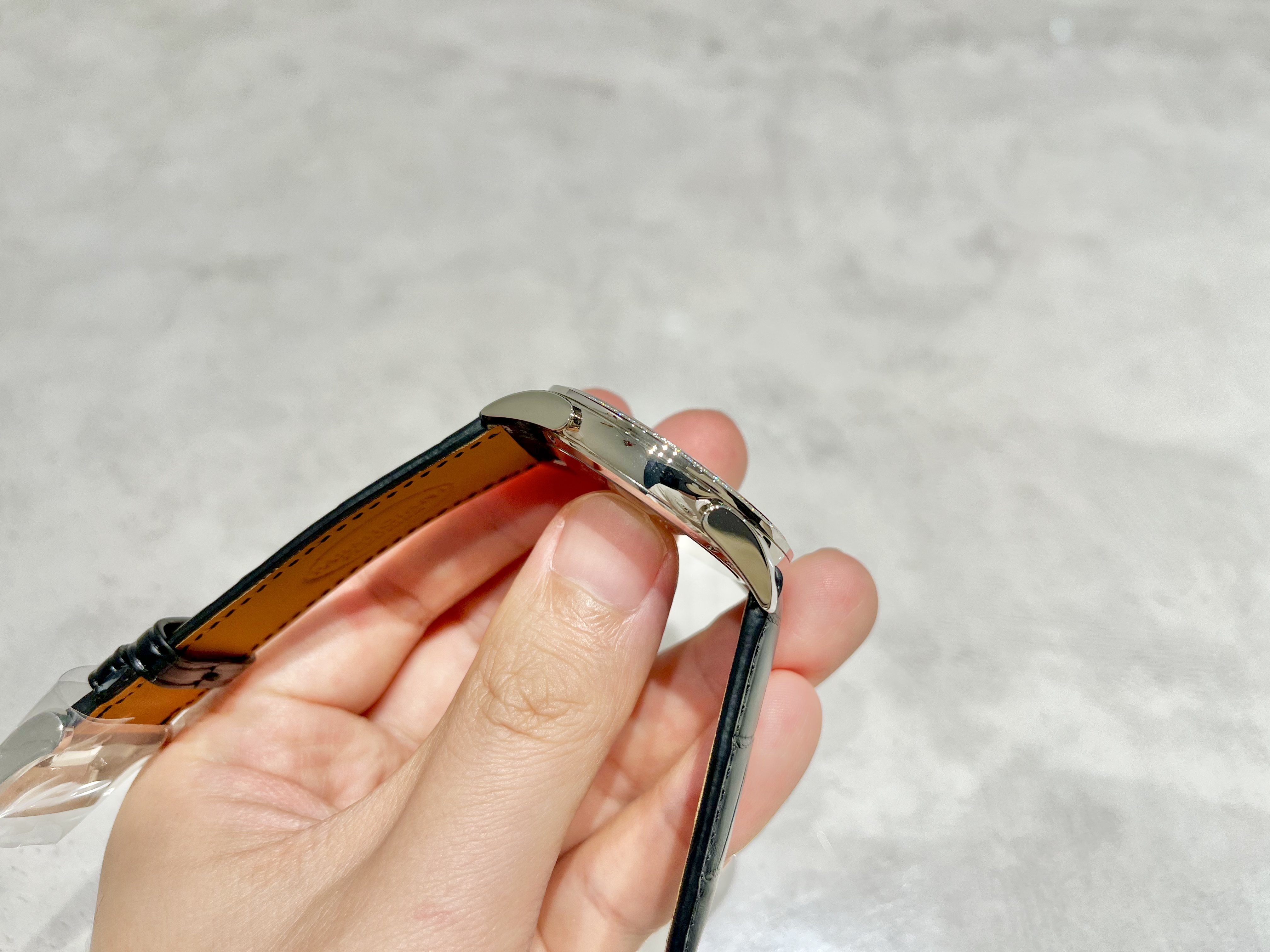 帕玛强尼 PFC267-1262400 表径39mm,18K白金镶钻表圈,PF701珍珠陀机芯,后配黑色皮带,原装表带为白色爱马仕表带几乎没怎么使用,库存品9.5新存放痕迹。公价218000元,全套55888元。