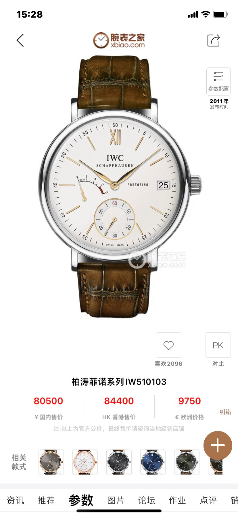 IWC万国波涛菲诺系列“8日链”IW510103手动机械男士腕表,45mm表径,日期显示,动力储备显示,8天长动力 公价80500,现单表好价