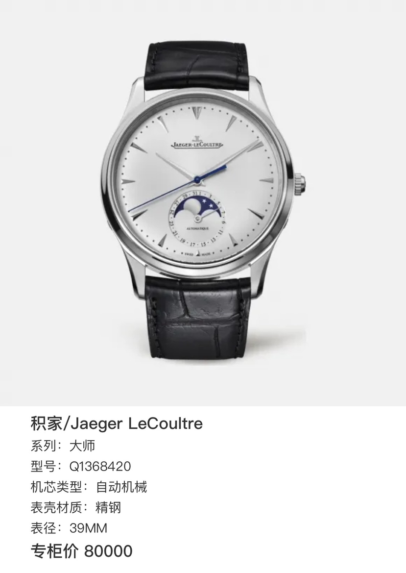 积家/Jaeger LeCoultre 大师 Q1368420 自动机械 精钢 39MM 附件:全套专柜价 80000