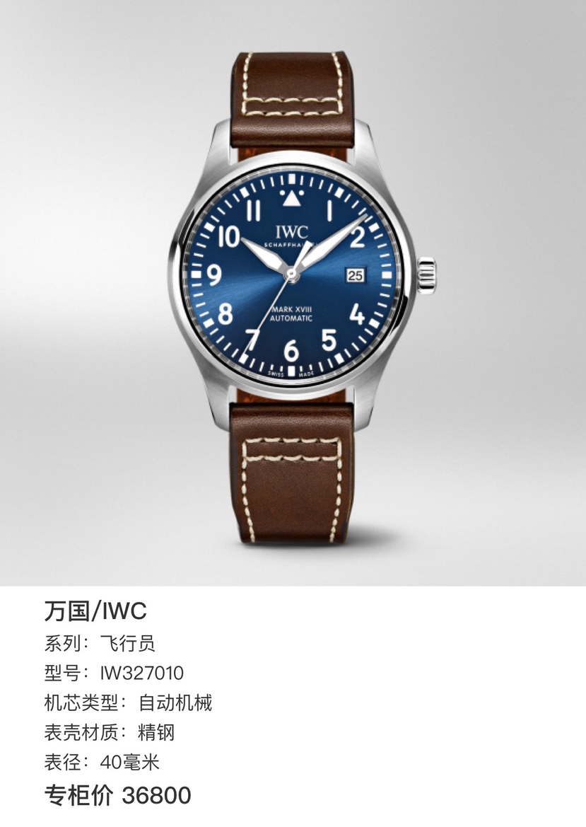 万国/IWC 飞行员 IW327010 自动机械 精钢 40毫米 专柜价 36800
