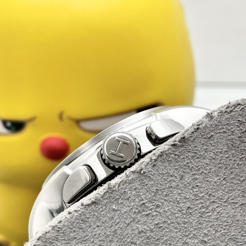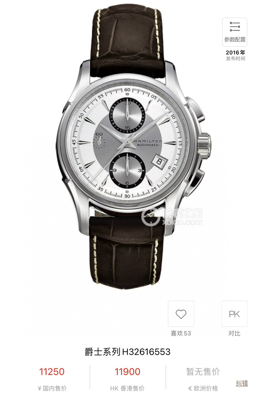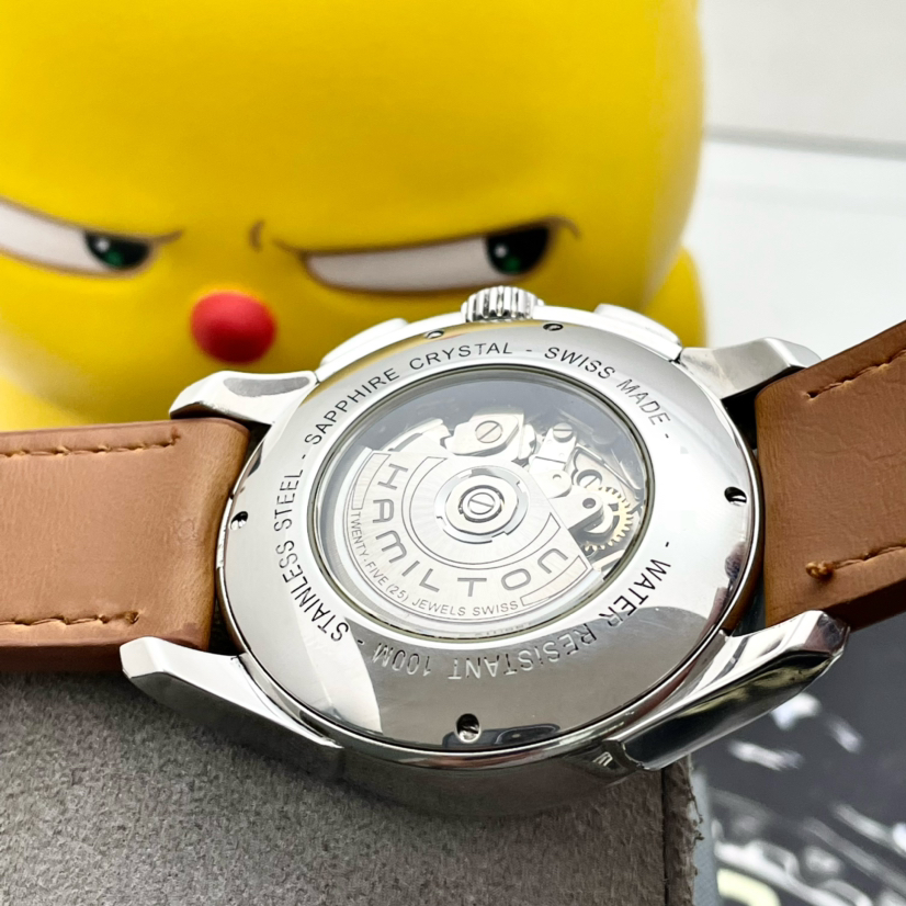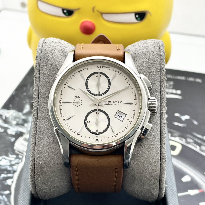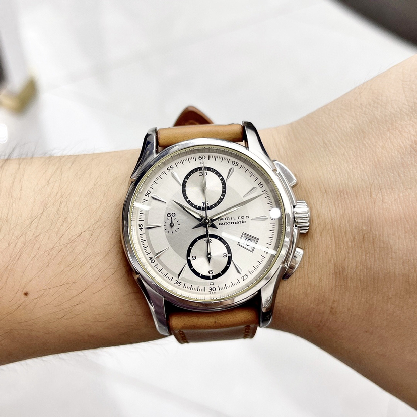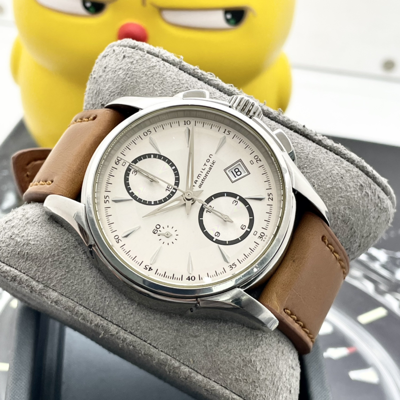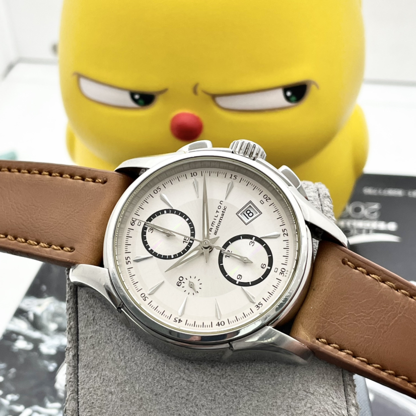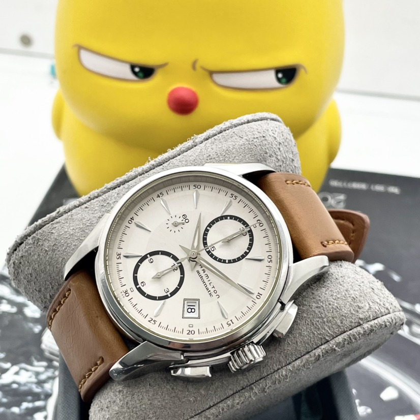 汉密尔顿爵士系列,自动机械男士腕表,42mm表径,整表精钢材质,白盘黑边三眼计时表盘,表盘布局精美,上手很有内涵很具品味!