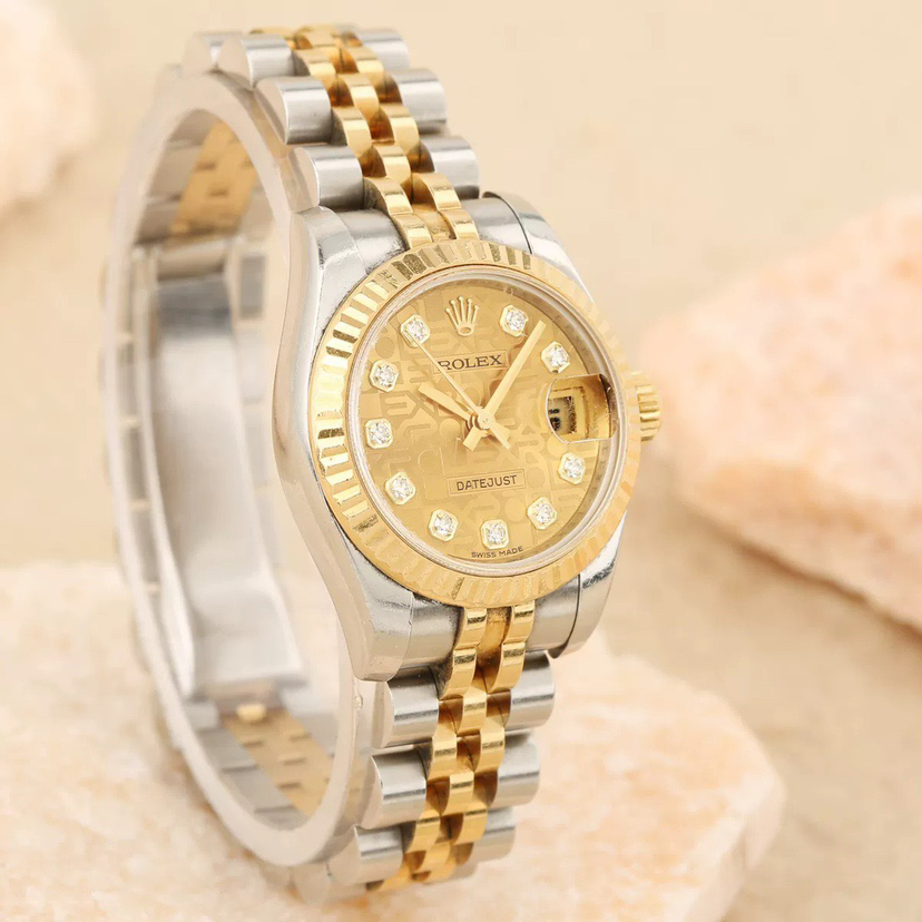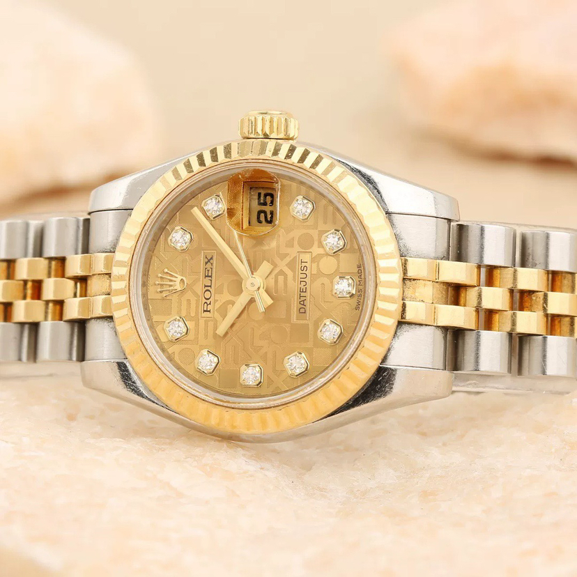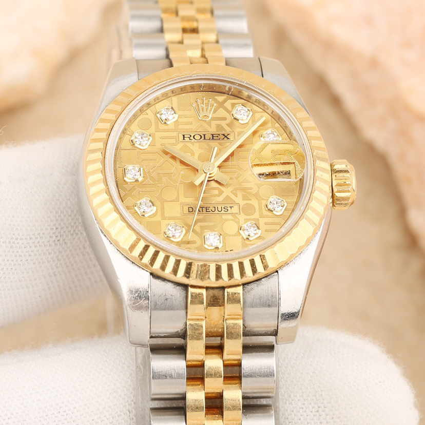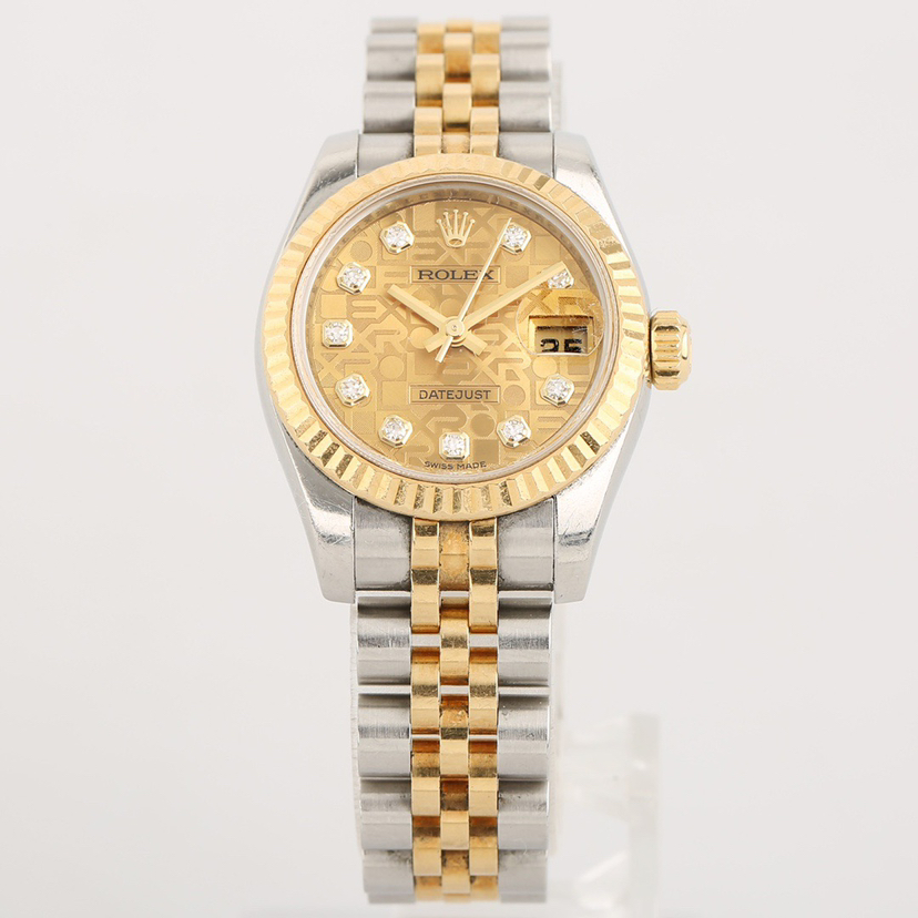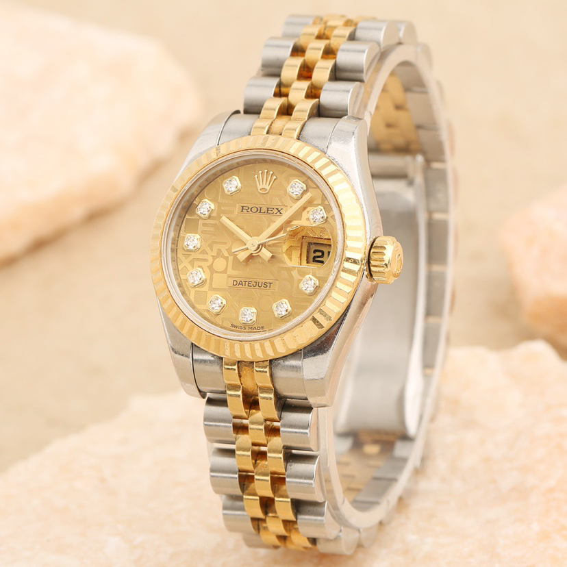 劳力士日志系列179173-63133自动机械女士腕表,26mm表径,18k黄金间金材质,钻刻电脑面,大日历,公价86800,现单表好价