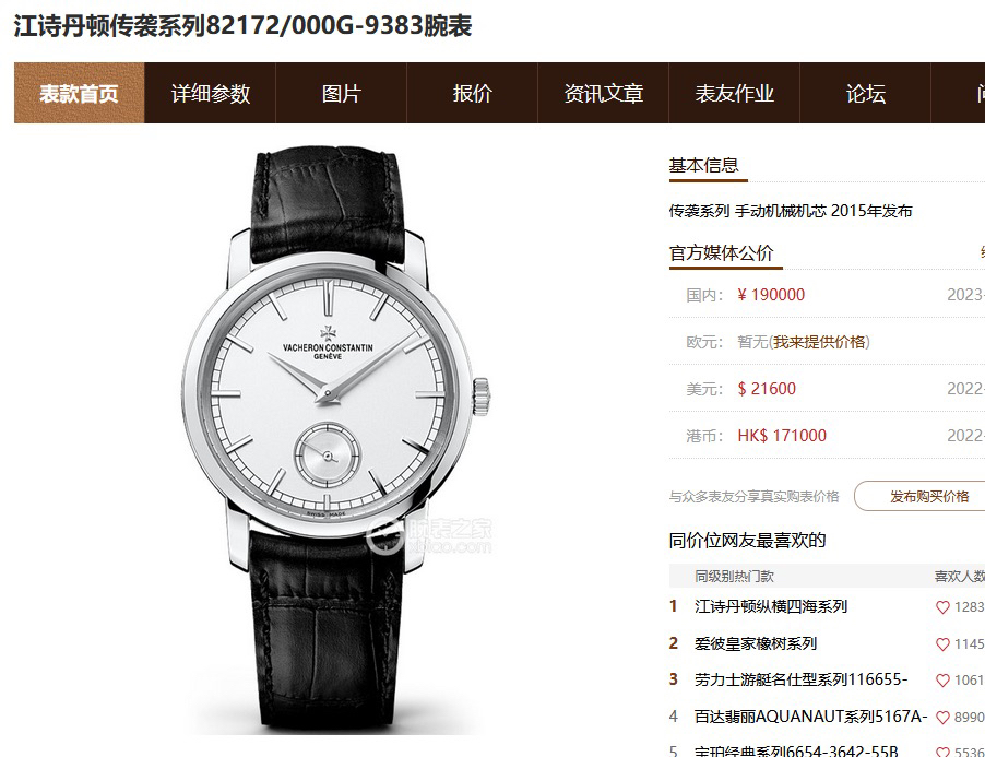 江诗丹顿传袭系列82172/000G-9383,18K白金,手动机械,38mm表径,小秒盘设计,公价190000元,现单表好价