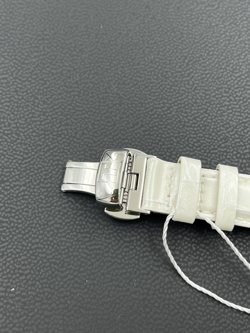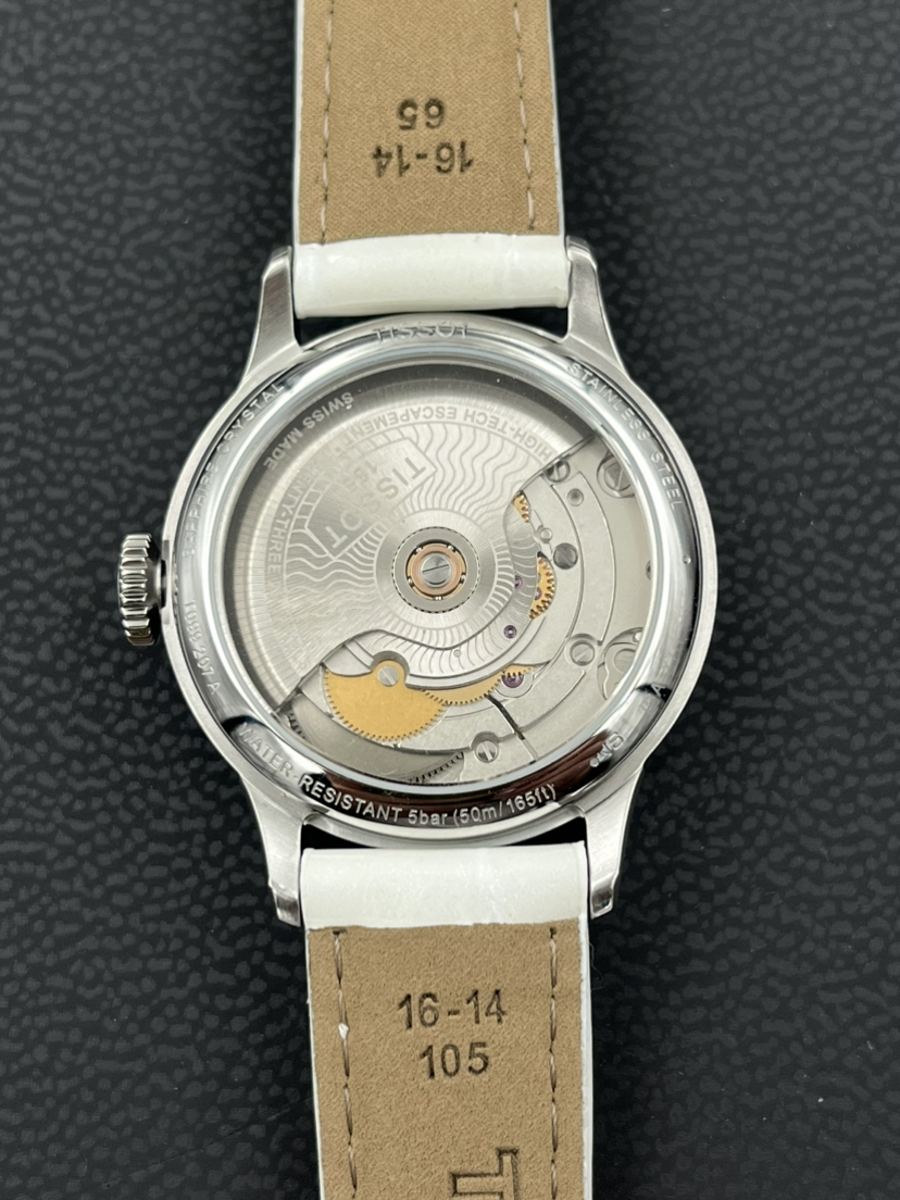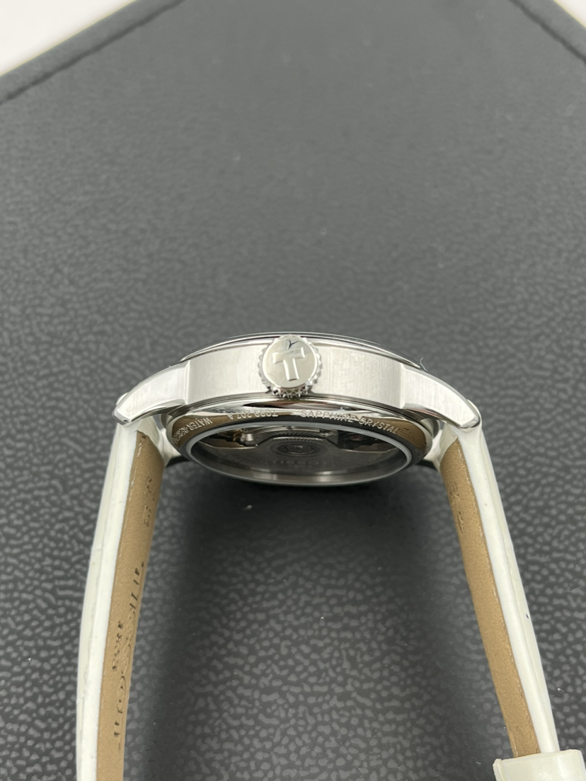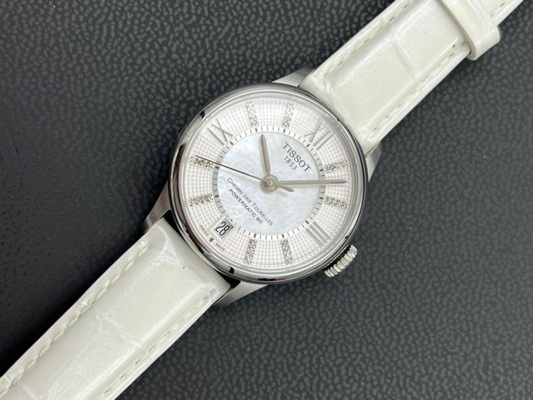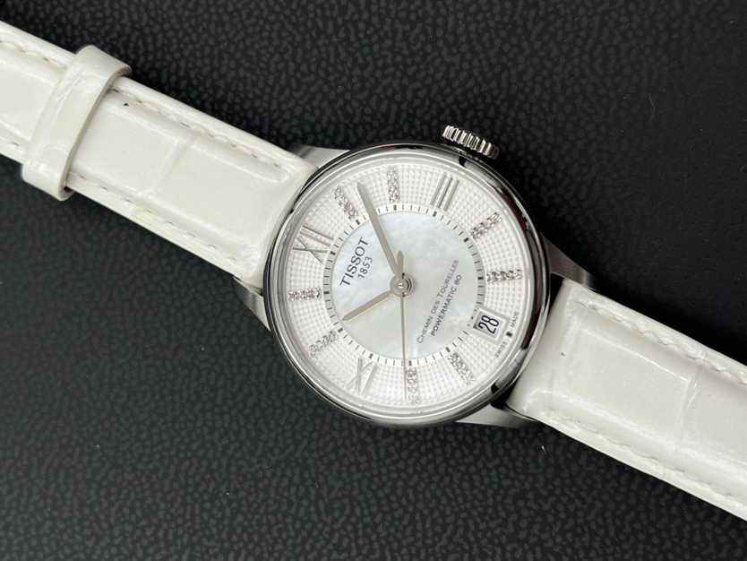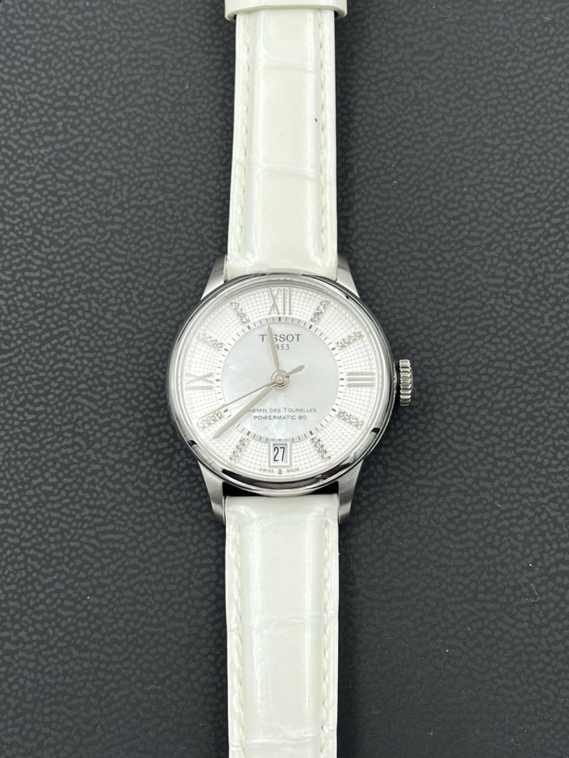 天梭经典系列T099.207.16.116.00自动机械女士腕表,32mm表径,巴黎铆钉表盘,镶嵌32颗钻石,白色珍珠贝母盘,精钢材质,六点钟日历显示,折叠扣,全新后配表带,公价7250,现22年全套