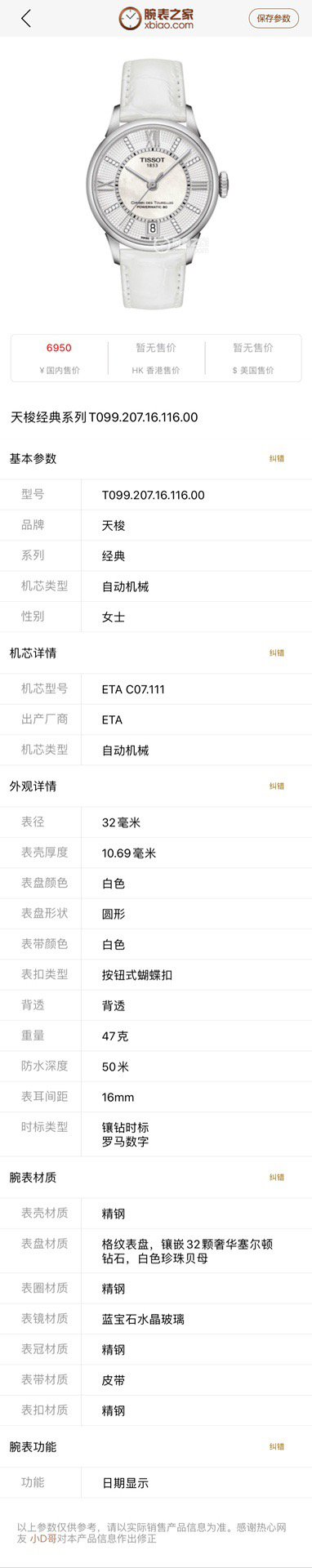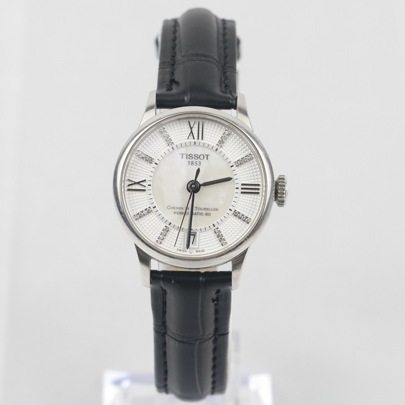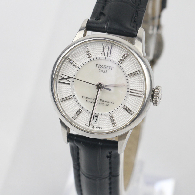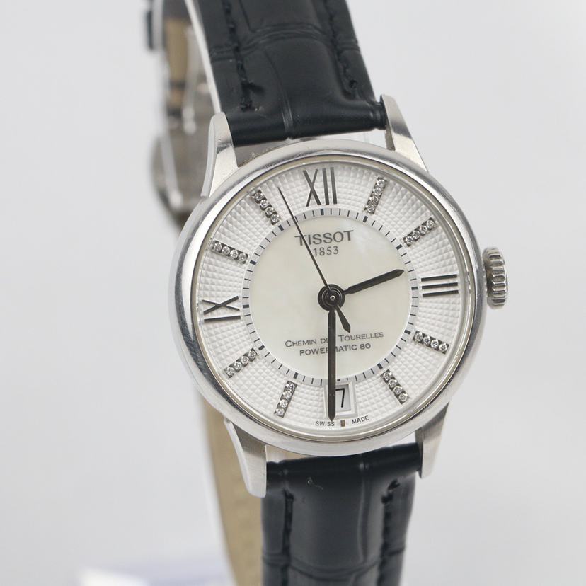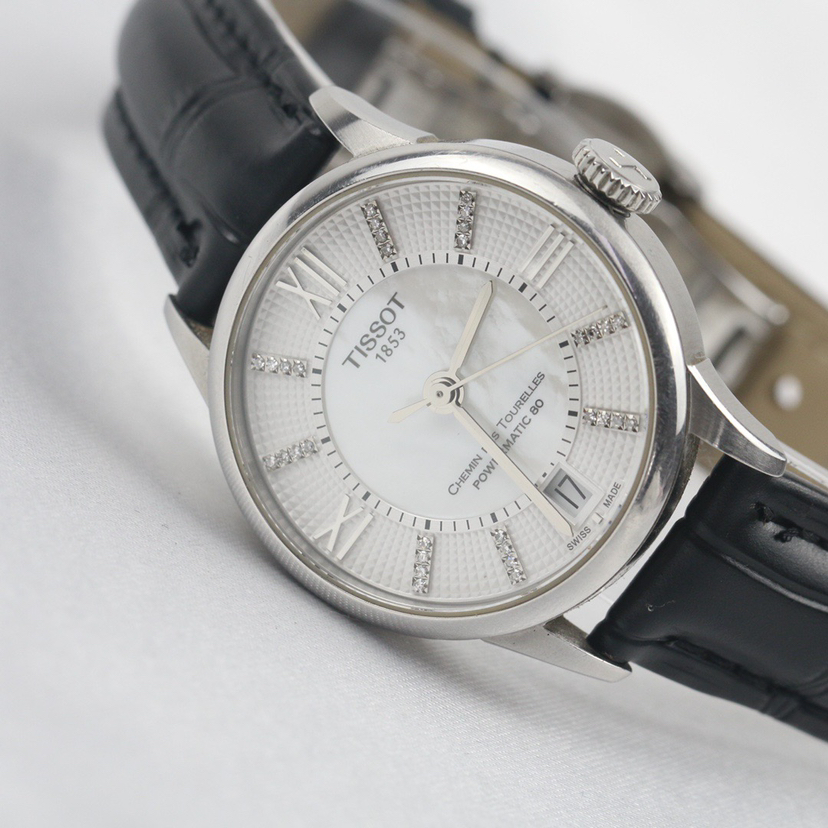 天梭经典系列T099.207.16.116.00自动机械女士腕表,32mm表径,巴黎铆钉表盘,镶嵌32颗钻石,白色珍珠贝母盘,精钢材质,六点钟日历显示,折叠扣,全新后配表带,公价7250,现22年全套