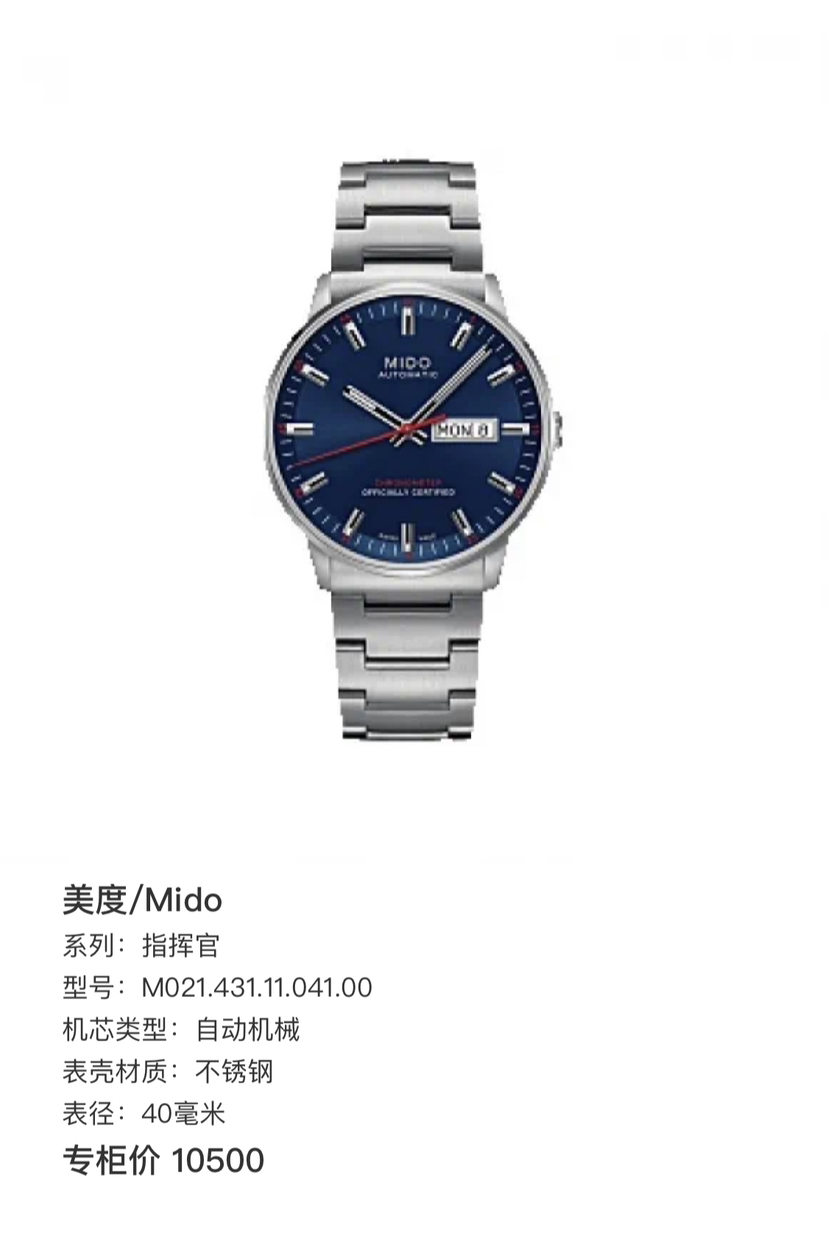 美度/Mido 指挥官 M021.431.11.041.00 自动机械 不锈钢 40毫米 专柜价 10500