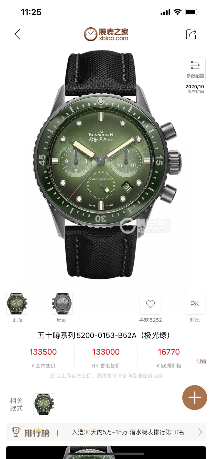 宝珀五十噚Fifty Fathoms 极光绿 5200-0153-B52A机械男性