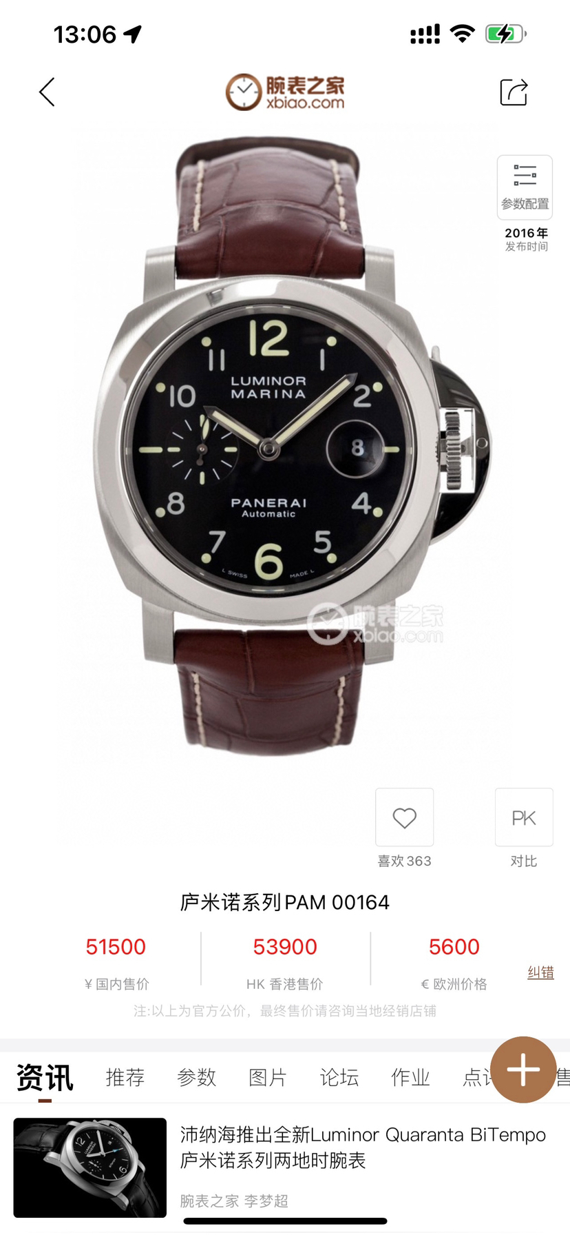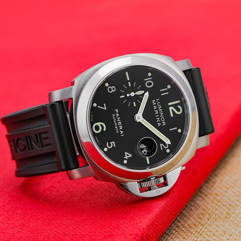 沛纳海沛纳海LUMINOR系列PAM00164男士机械腕表,44mm表径,大日历显示,小秒针,强夜光,阿拉伯数字刻度,折叠表扣,专柜售价51500元,现货好价21800