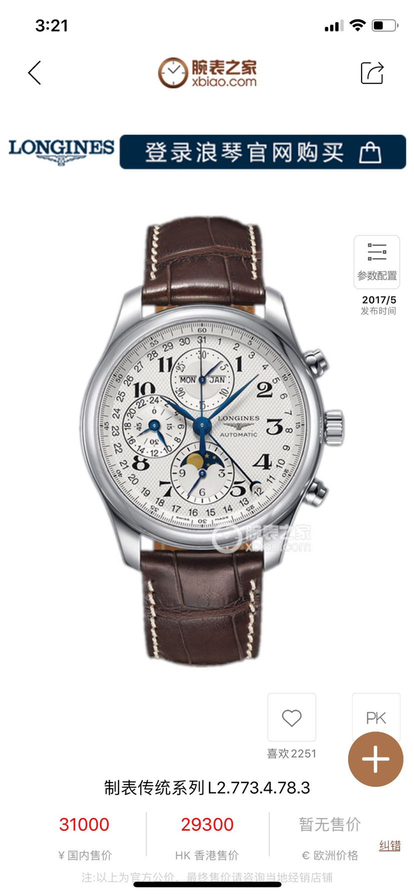 浪琴名匠L2.773.4.78.3八针月相男表!大盘表径42mm!自动机械新款机芯!原价31000