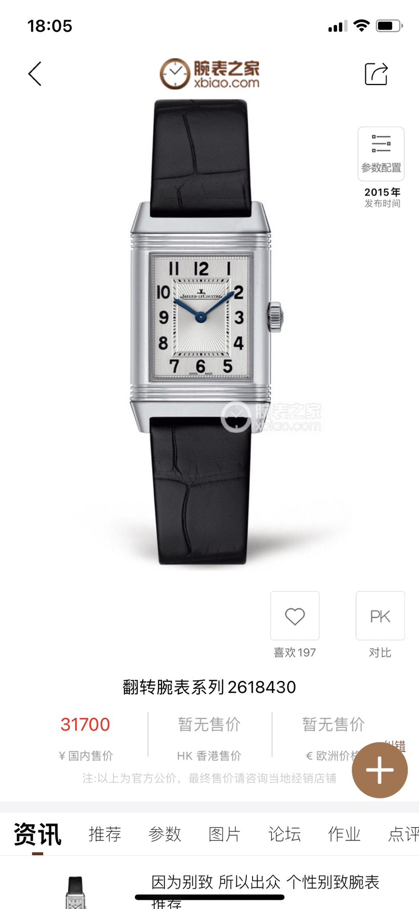 积家经典翻转系列2618430石英机芯女士腕表,尺寸21×34毫米,成色完美走时精准。极品单表,工价31700元