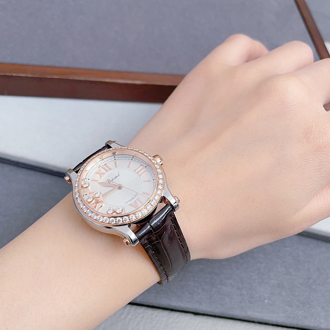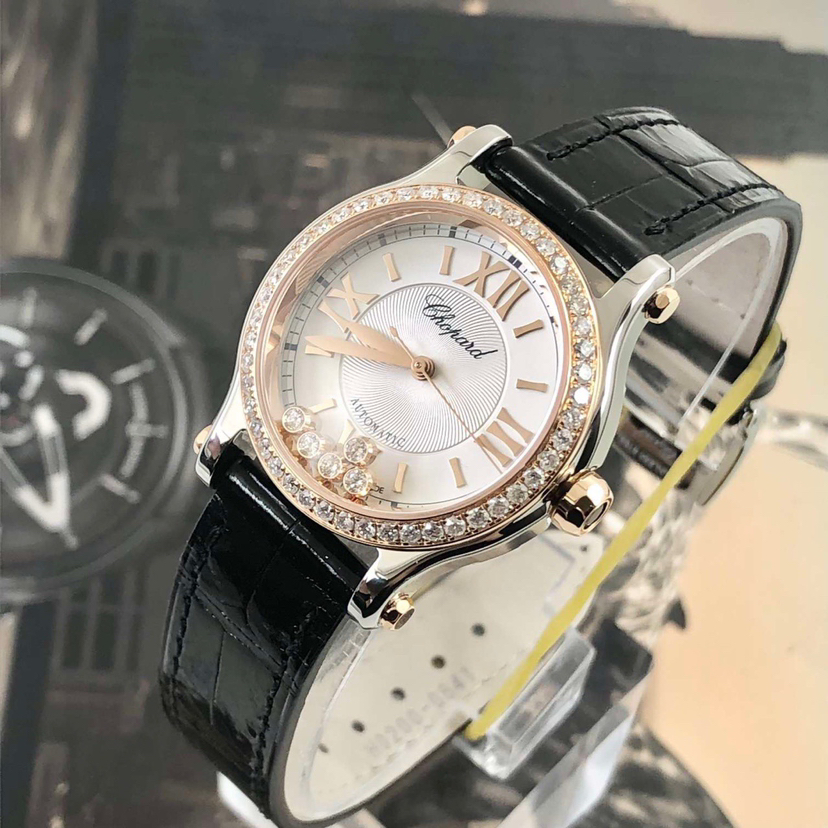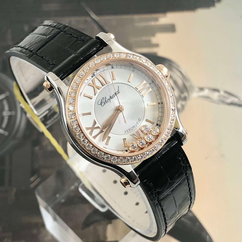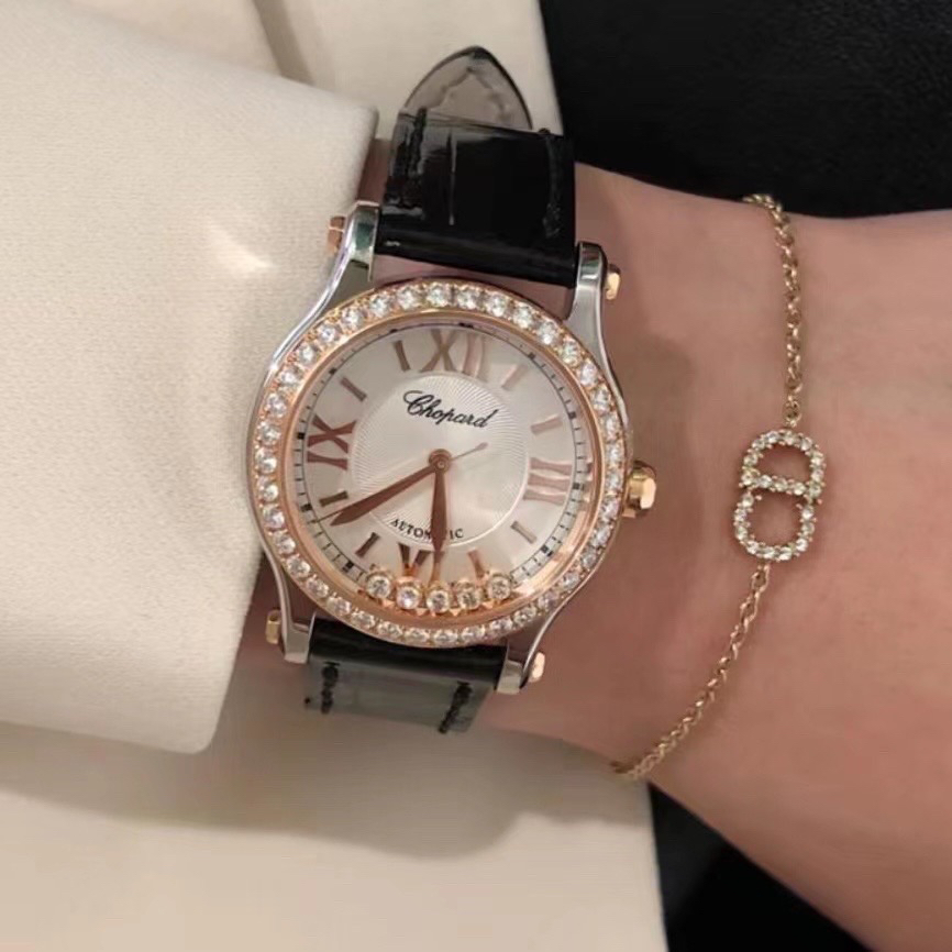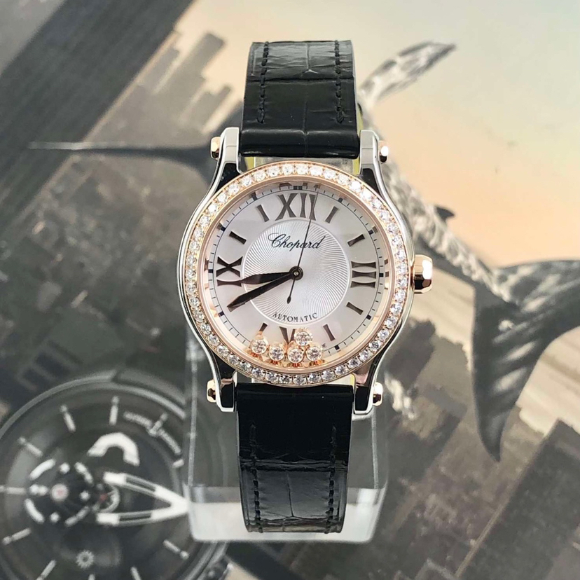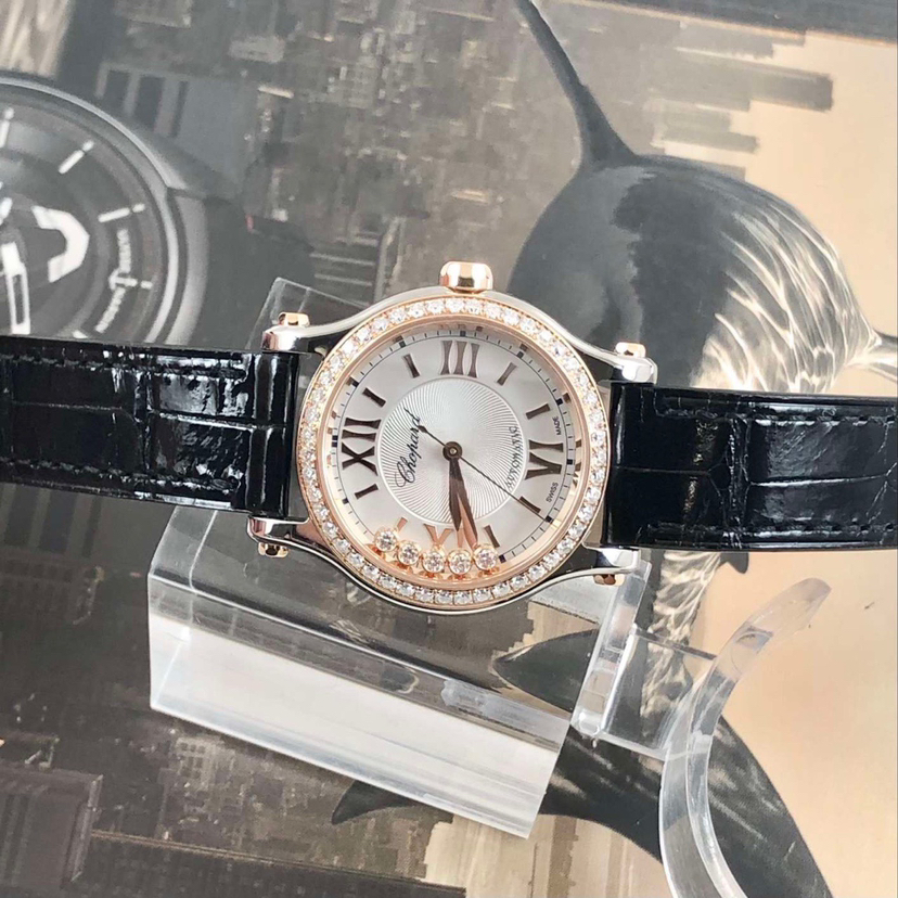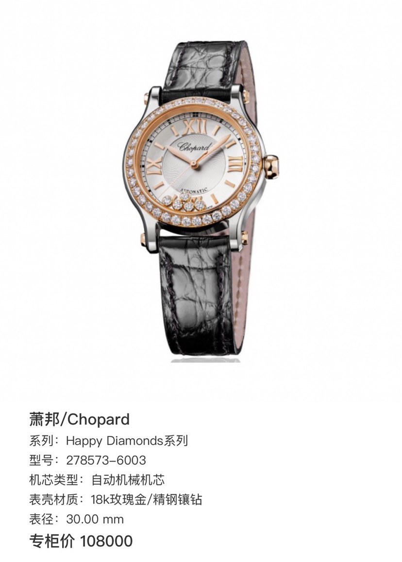 萧邦Happy Sports快乐钻石系列278573-6001自动机械女表,18k玫瑰金后镶钻 搭配精钢材质表壳,表径30mm,原钻公价108000,现单表好价分享