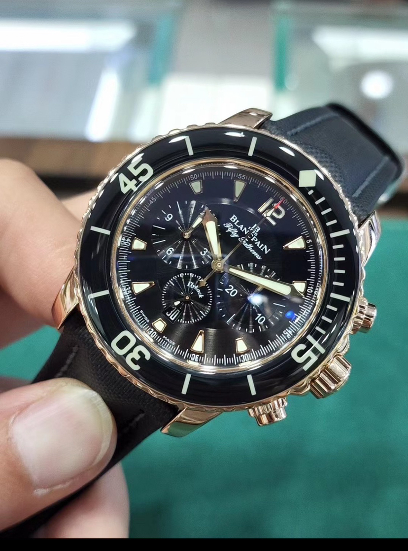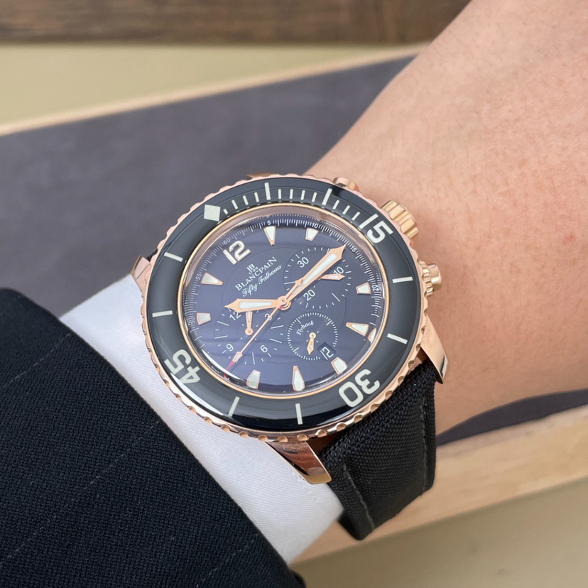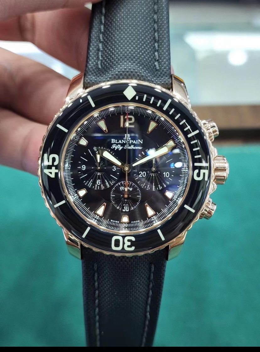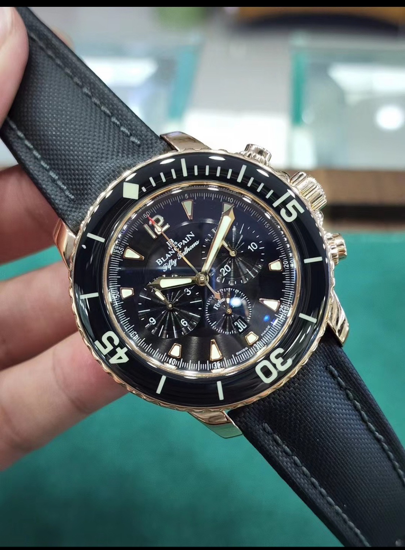宝珀五十噚系列型号:5085F-3630-52A,腕表特征:自动机械男士 18K玫瑰金材质,45mm表径,黑色陶瓷圈超强夜光,附件:22年极品全套公价250500