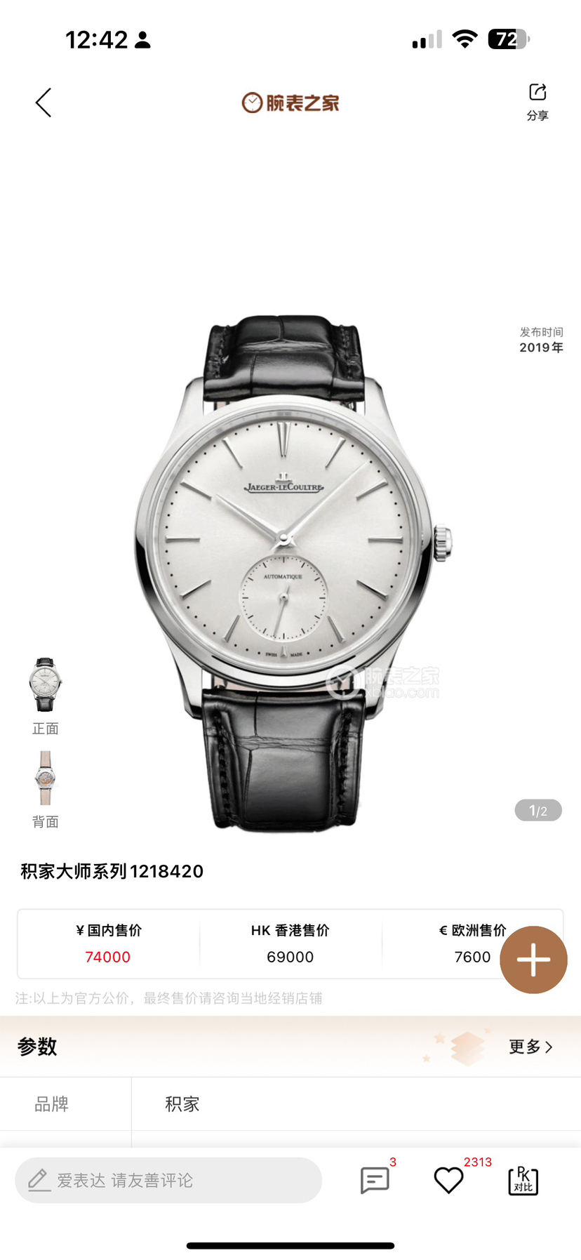 积家超薄大师系列1218420,39mm自动机械,精钢材质,新款金陀,成色极品,折叠扣,专柜价74000