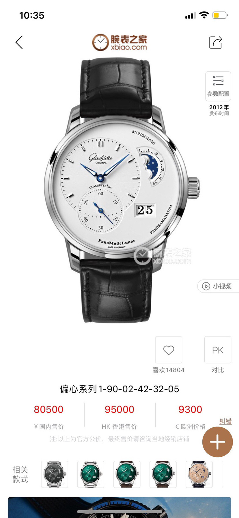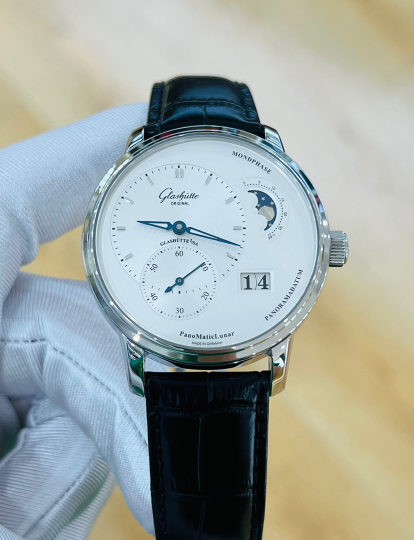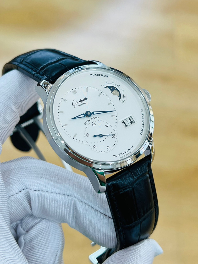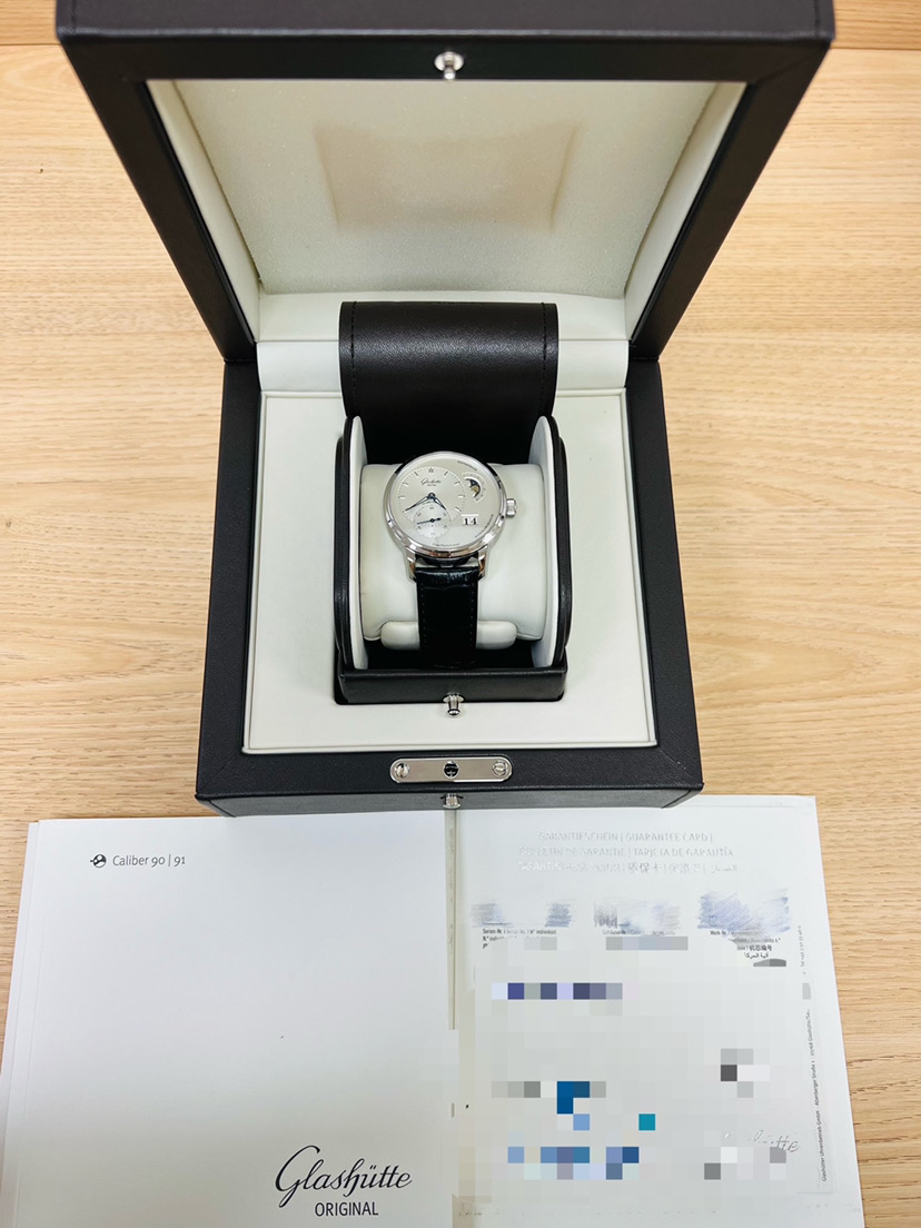 格拉苏蒂90原创偏心系列男士机械腕表,型号1-90-02-42-32-05表径40mm格拉苏蒂当家大热门款,经典偏心月相设计,背透双鹅颈机芯超级漂亮,专柜定价80500。附件 极品全套