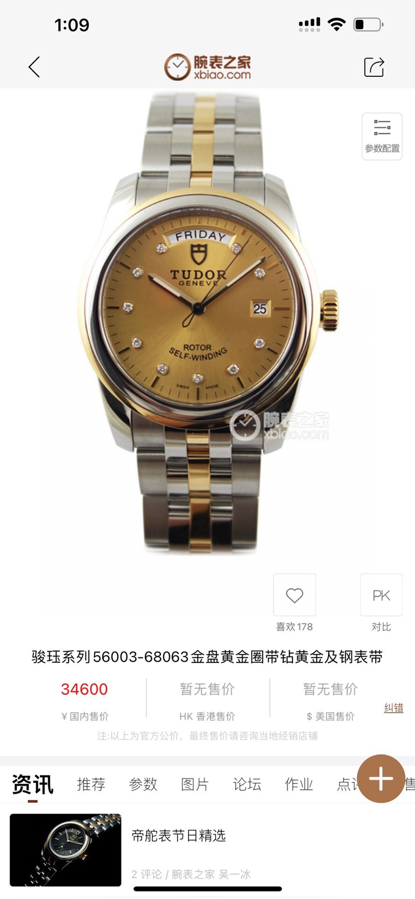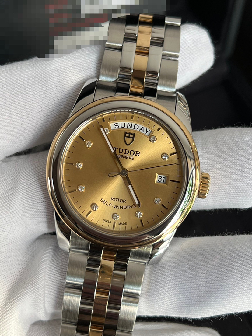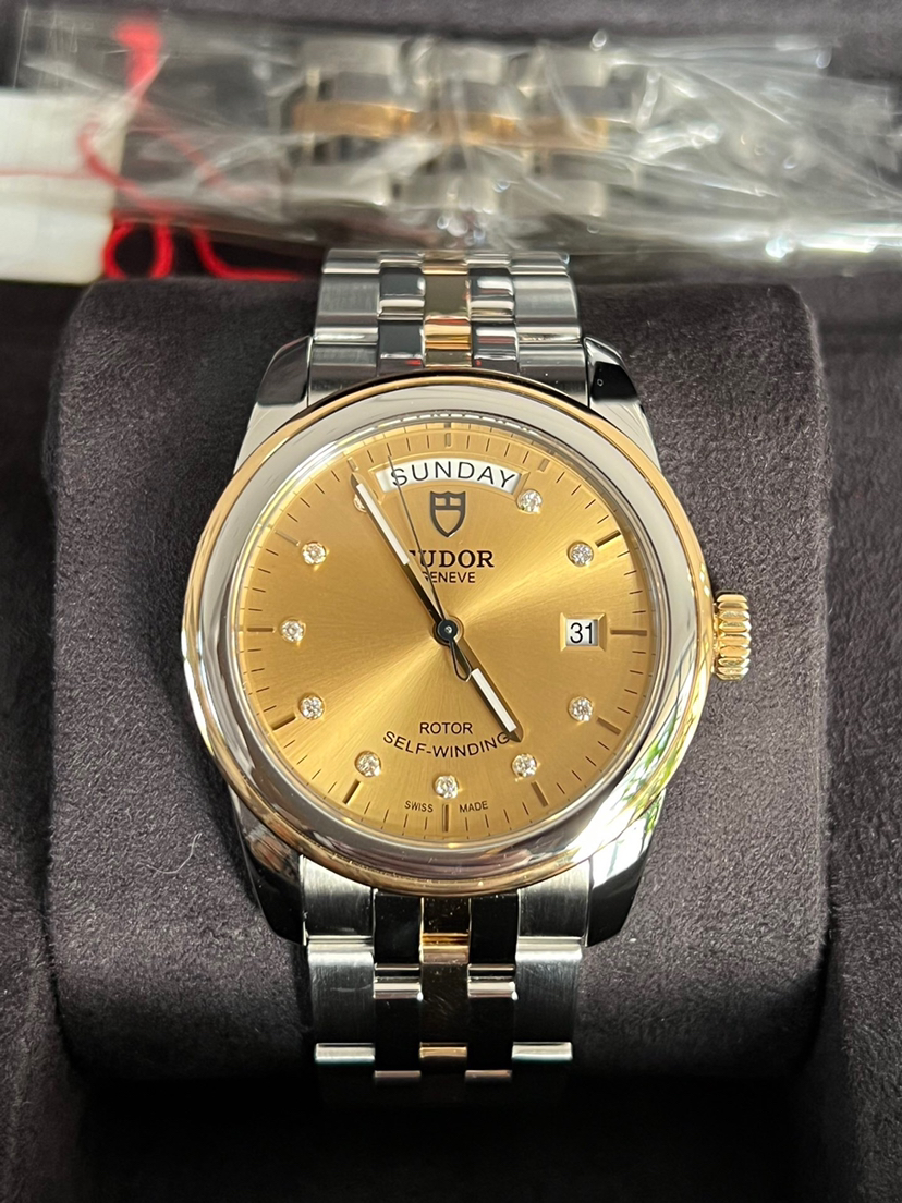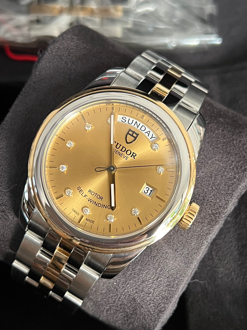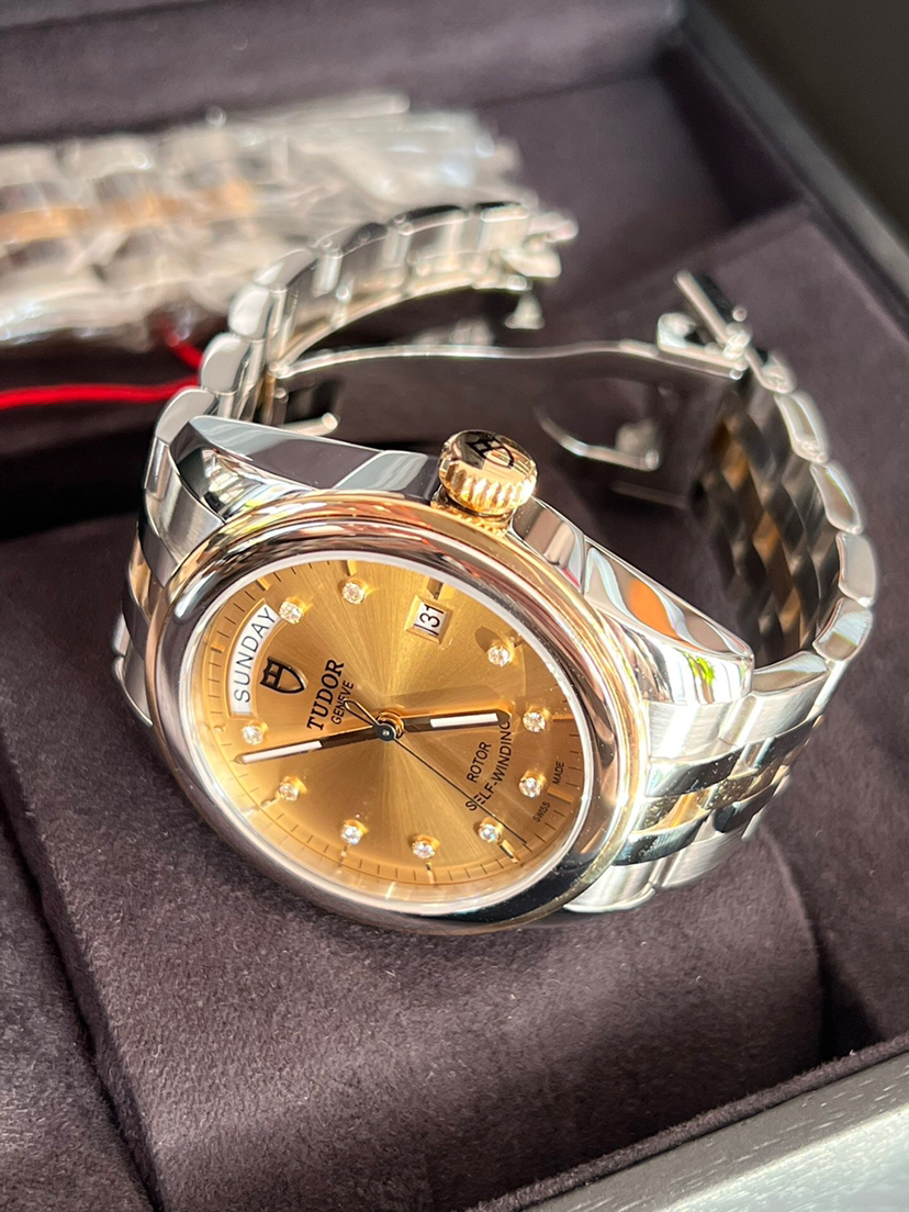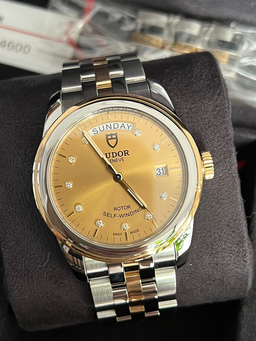帝舵骏钰系列型号:56003双历星期显示自动机械腕表,18k间黄金钻石刻度表径39mm 品相完美成色极品热门休闲百搭款专柜价34600!