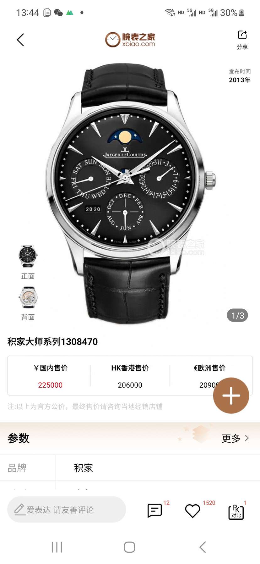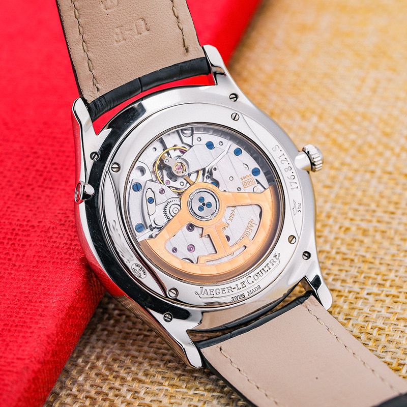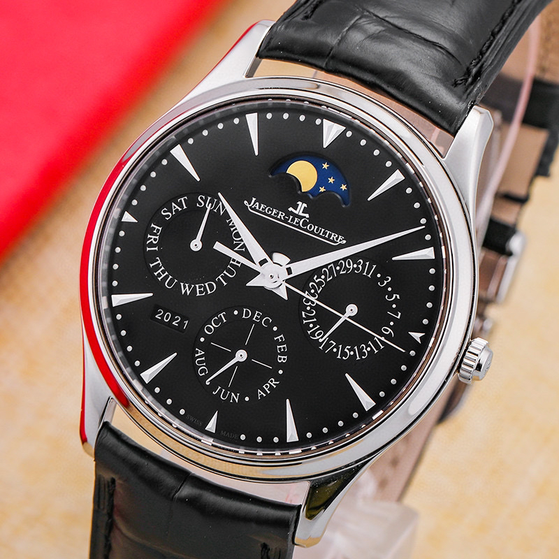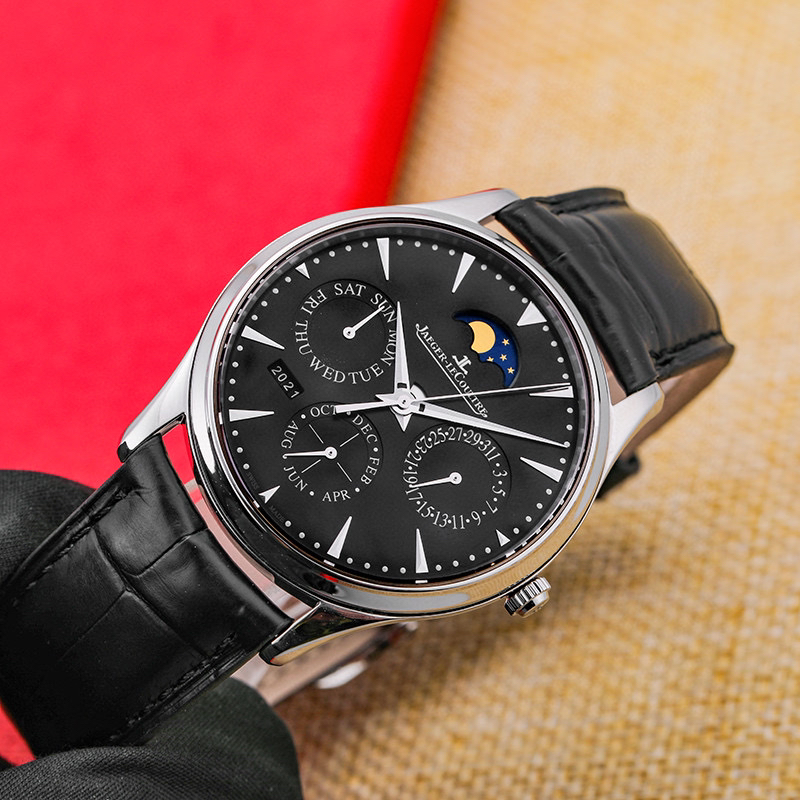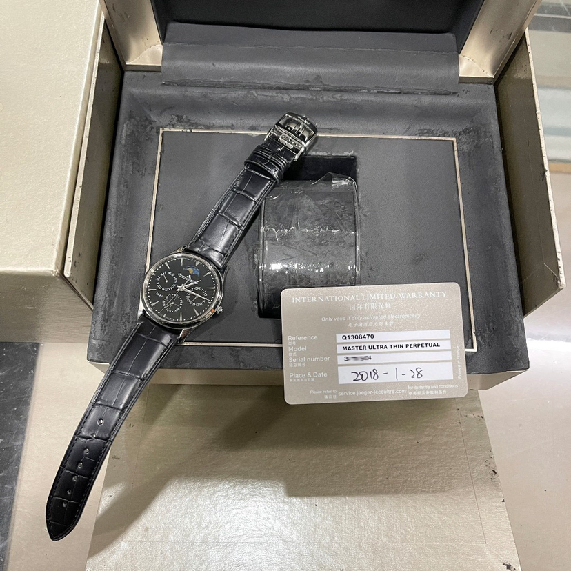 积家大师系列Q1308470男士自动机械腕表,表径39mm,厚度9.2毫米,超薄万年历大师系列,精钢材质,表盘黑色放射状拉丝,镀铑抛光镶贴,18年1月全套,已经申请8年联保,保修到2026年1月,专柜价格205000,现货好价78000