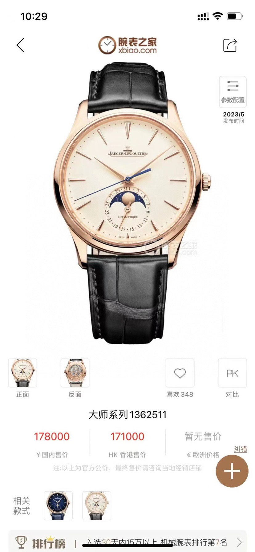 23年最新款积家大师系列1362511玫瑰金月相,全球质保8年,39表径,自动机械,全套未使用品,专柜178000
