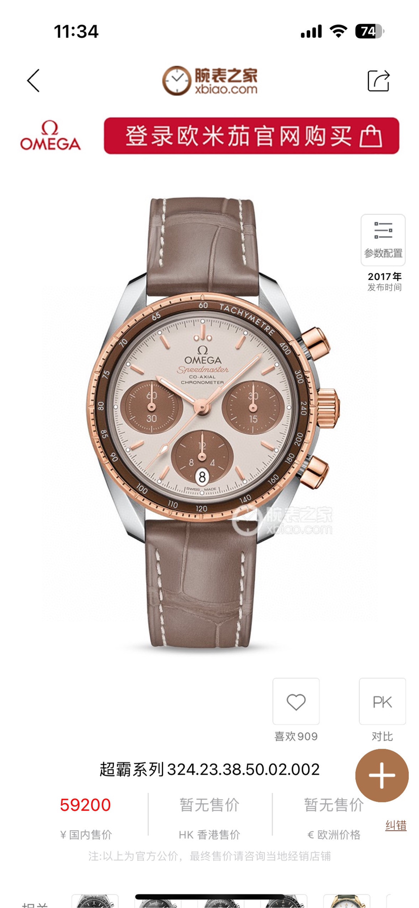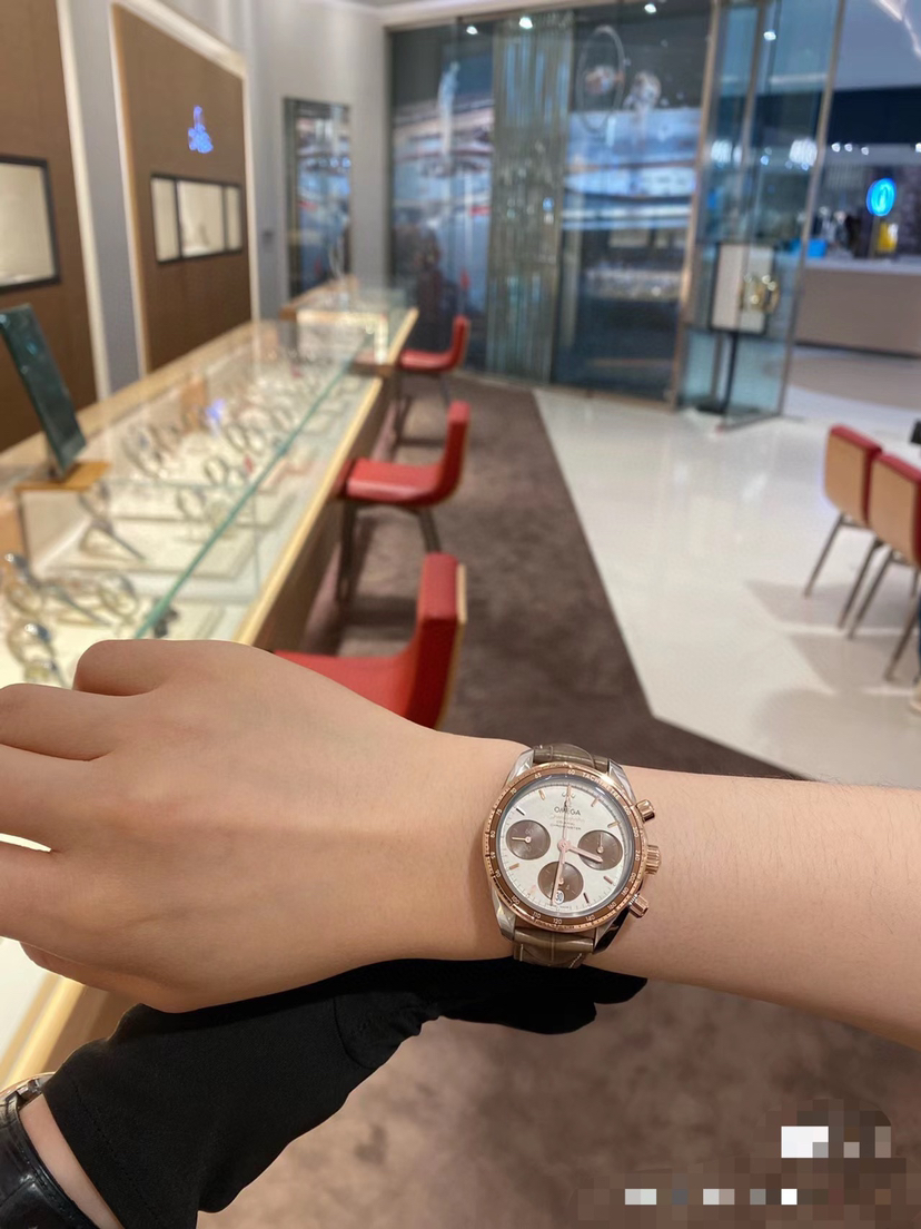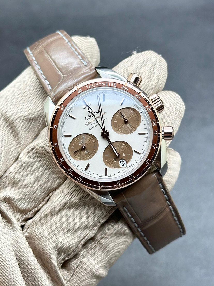 欧米茄324.23.38.50.02.002超霸卡布奇诺,38mm自动机械,间18k玫瑰材质,公价59200 附件 极品全套