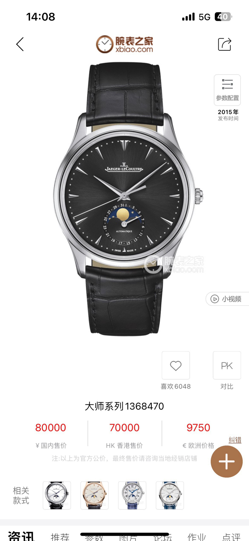 积家 大师月相Q1368470 自动机械 表径39MM 日历显示 月相功能 专柜80000