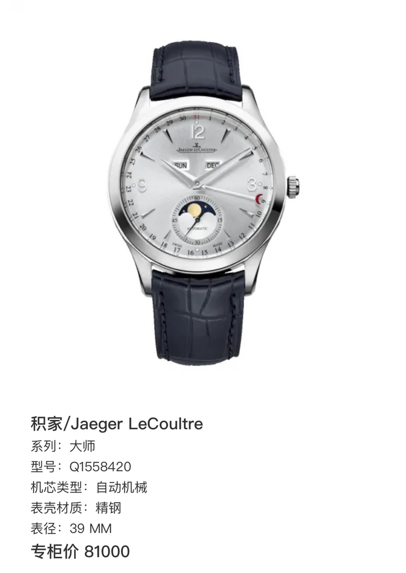 积家/Jaeger LeCoultre 大师 Q1558420 自动机械 精钢 39 MM 附件:极品全套 专柜价 81000———顾客需知———