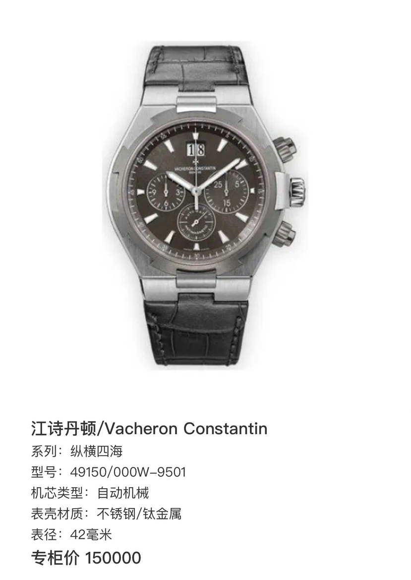 江诗丹顿/Vacheron Constantin 纵横四海 49150/000W-9501 自动机械 不锈钢/钛金属 42毫米 专柜价 150000