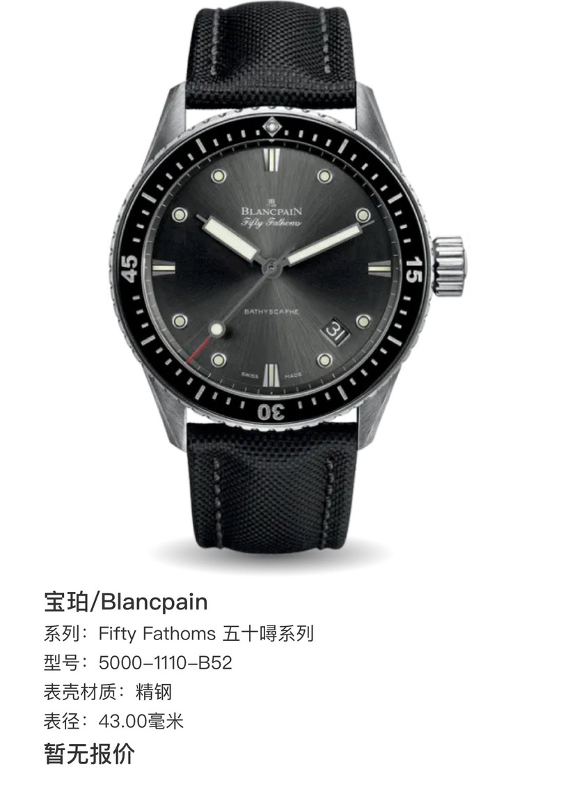 宝珀五十噚系列 型号:5000-1110-B52A 精钢 43.00毫米 附件:极品全套 专柜价:82000