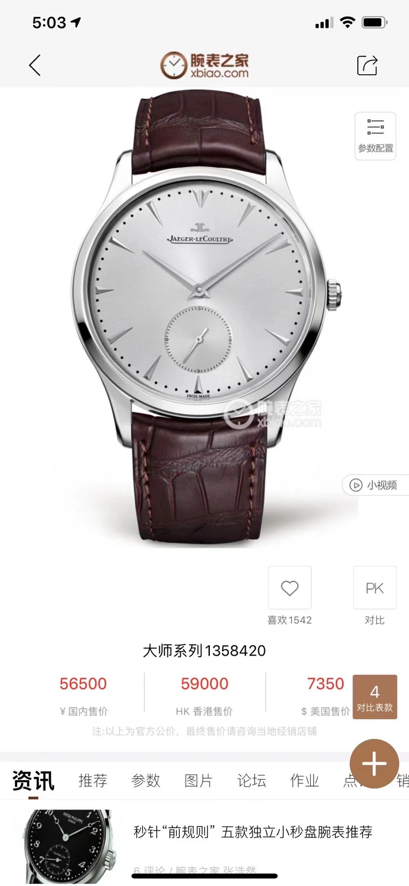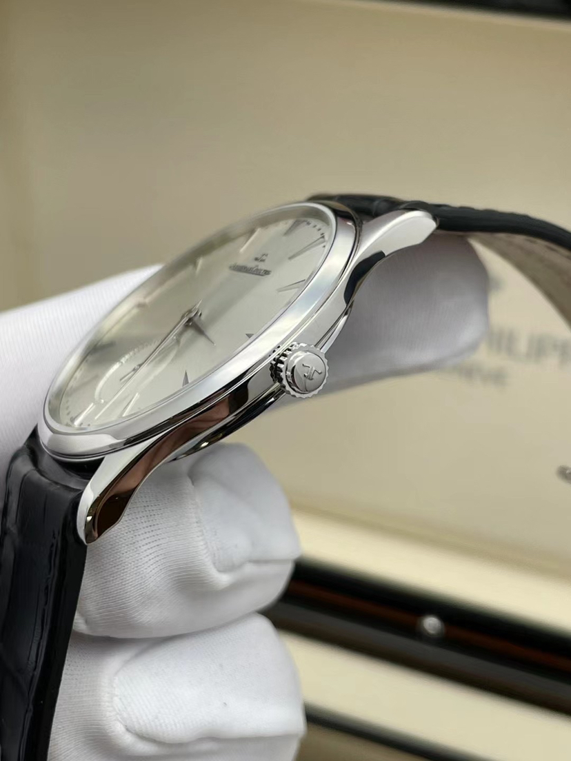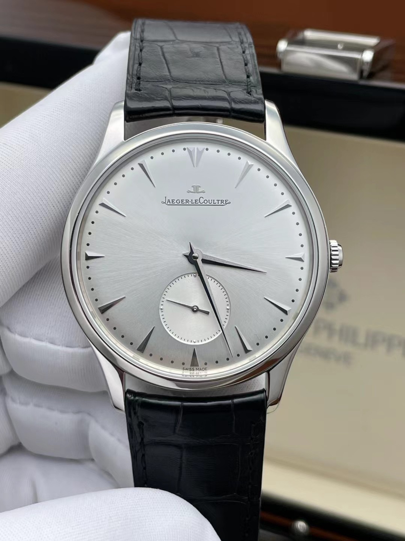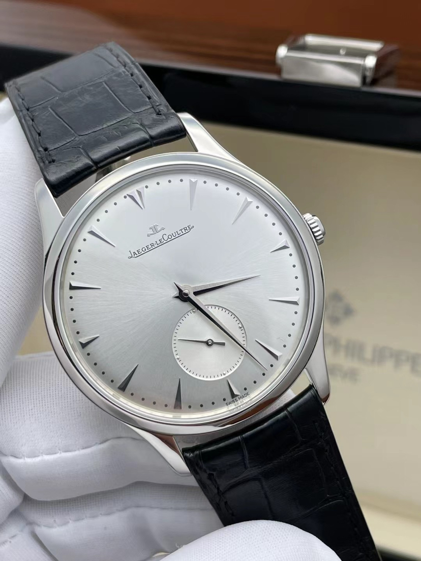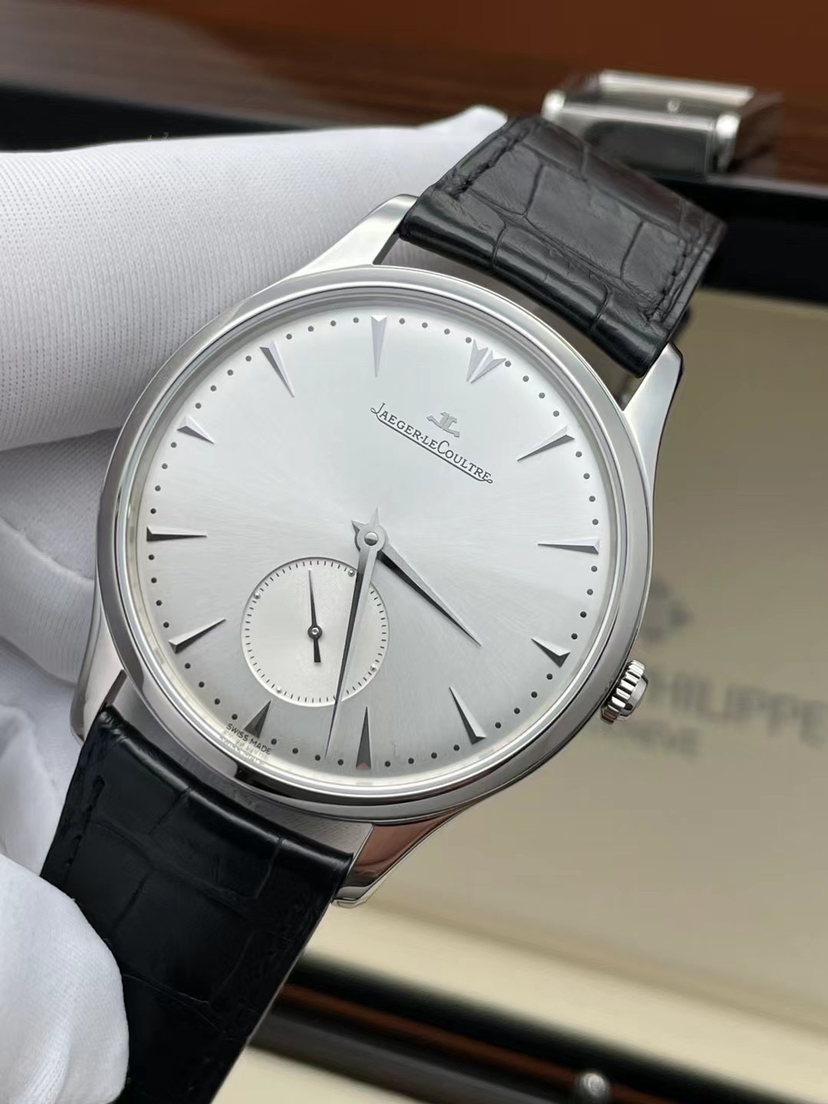 积家大师系列,1358420、自动机械、6点位独立秒针、折叠扣、热门正装休闲款、40MM口径、单表极品、公价56500、好价