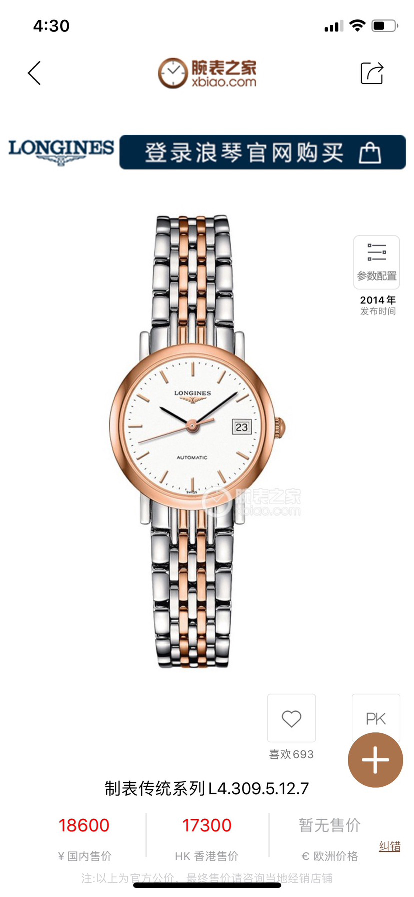浪琴博雅系列L4.309.5.12.7, 自动机械女表,表径25.5mm ,精钢/18K间金材质,正装优雅型风格最爱,超热门款,极品全套 公价18600