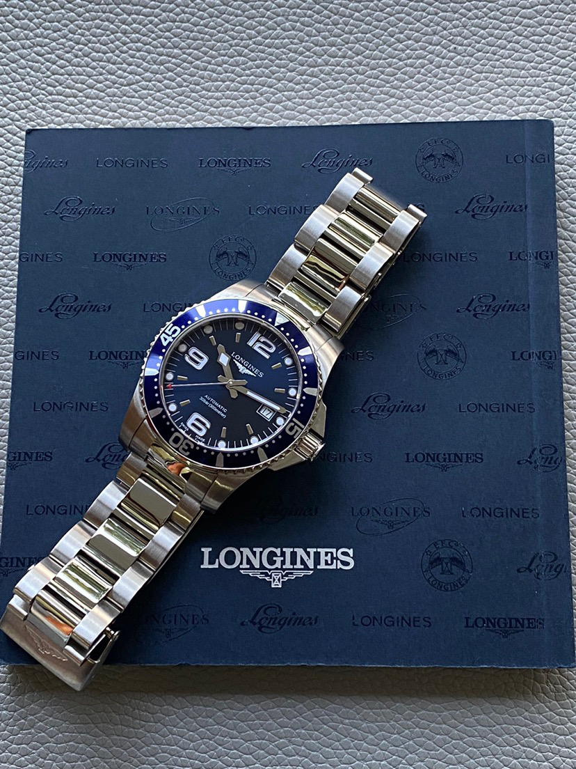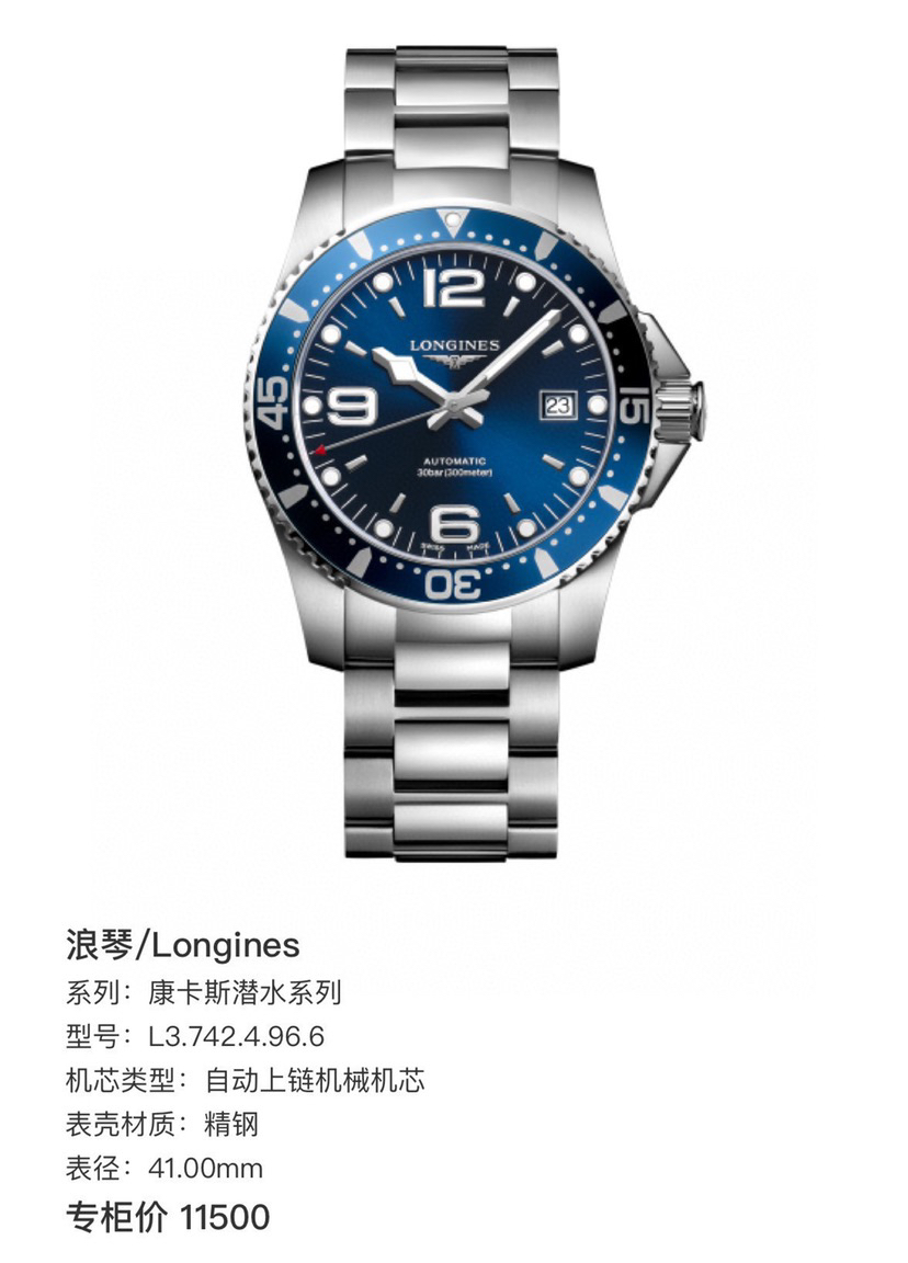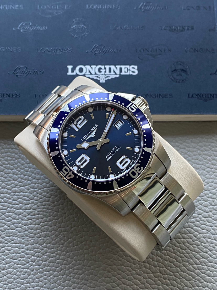 浪琴康卡斯L3.742.4.96.6 自动机械 直径41mm ,经典蓝盘设计,铝圈。旋入式表冠,防水高达300米,搭载L888机芯,走时完美 官方工价11500 附件 极品全套