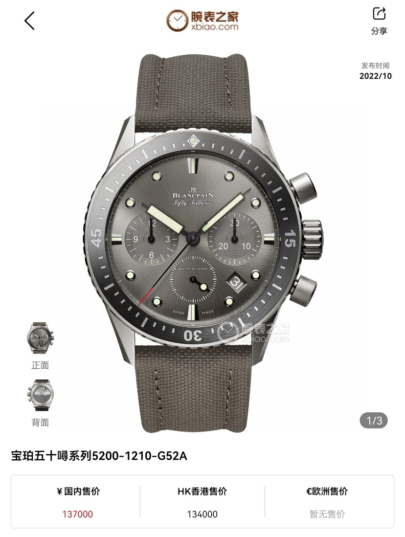 【未使用】宝珀5200-1210-G52A五十噚系列,计时寻,钛合金材质飞返计时,43mm表径,大全套,未使用品,公价137000,现货好价